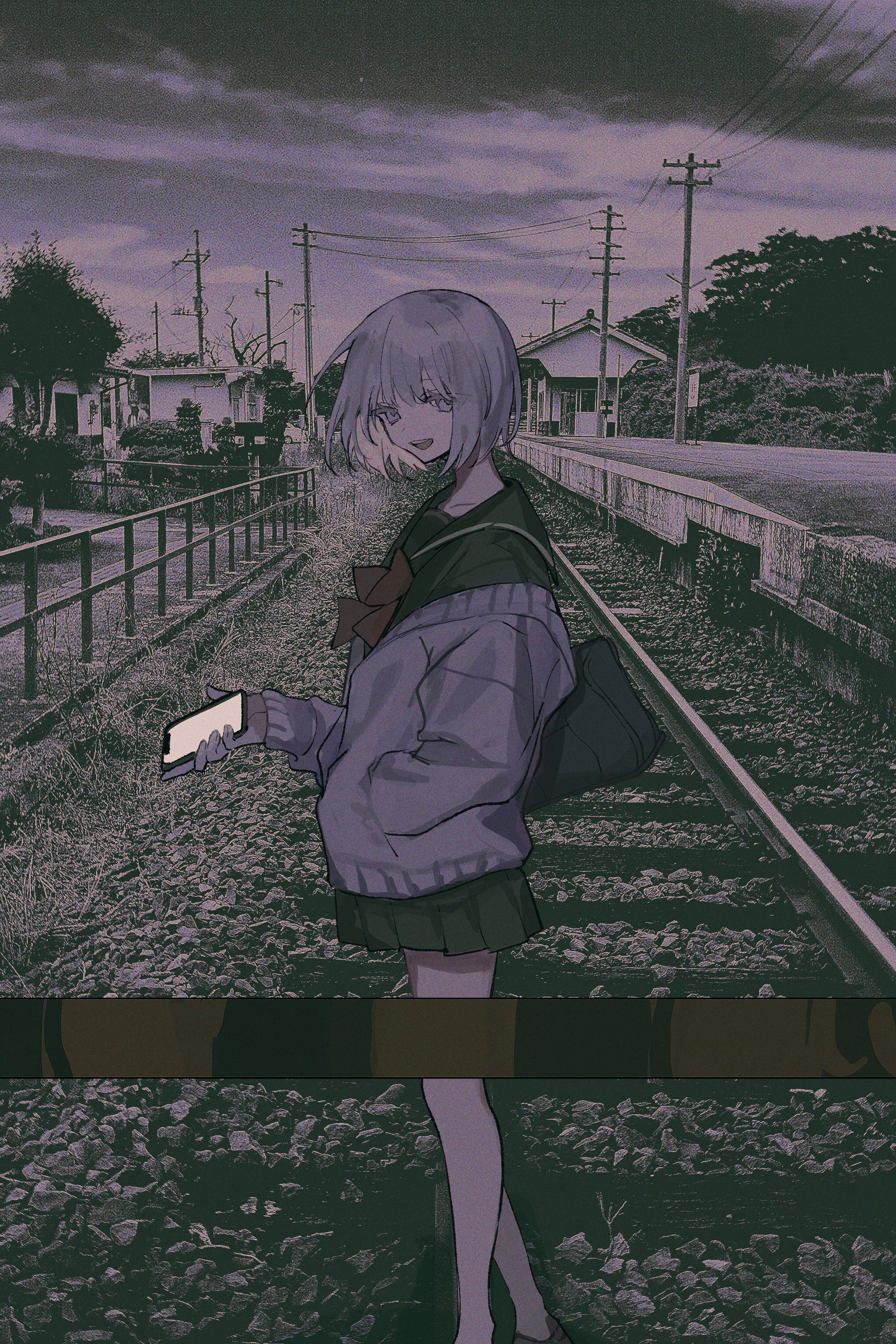 1girl :d absurdres bag black_serafuku bush cardigan cloud cloudy_sky collarbone feet_out_of_frame film_grain fingernails from_side grass grey_eyes grey_hair hand_in_pocket hand_up head_tilt highres holding holding_phone house long_sleeves looking_at_viewer medium_hair miniskirt muted_color night off_shoulder open_mouth original outdoors oversized_clothes phone photo_background power_lines railing railroad_crossing railroad_tracks red_ribbon ribbon rock sailor_collar scenery school_uniform serafuku shoulder_bag si_(wooupp) skirt sky smile solo standing teeth tree upper_teeth_only utility_pole vanishing_point wind
