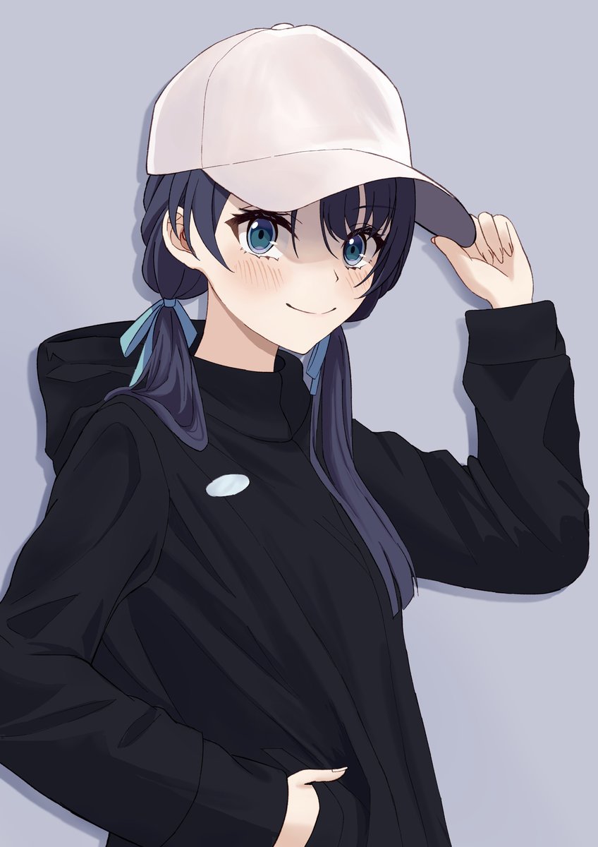 1girl adjusting_clothes adjusting_headwear alternate_costume baseball_cap black_hoodie blue_eyes blue_hair blue_ribbon blush closed_mouth commentary_request dark_blue_hair drop_shadow grey_background hair_between_eyes hair_ribbon hand_in_pocket hand_up hat highres hood hood_down hoodie link!_like!_love_live! long_hair long_sleeves looking_at_viewer love_live! low_twintails murano_sayaka ribbon simple_background smile solo split_mouth twintails upper_body virtual_youtuber wachida_01d white_hat