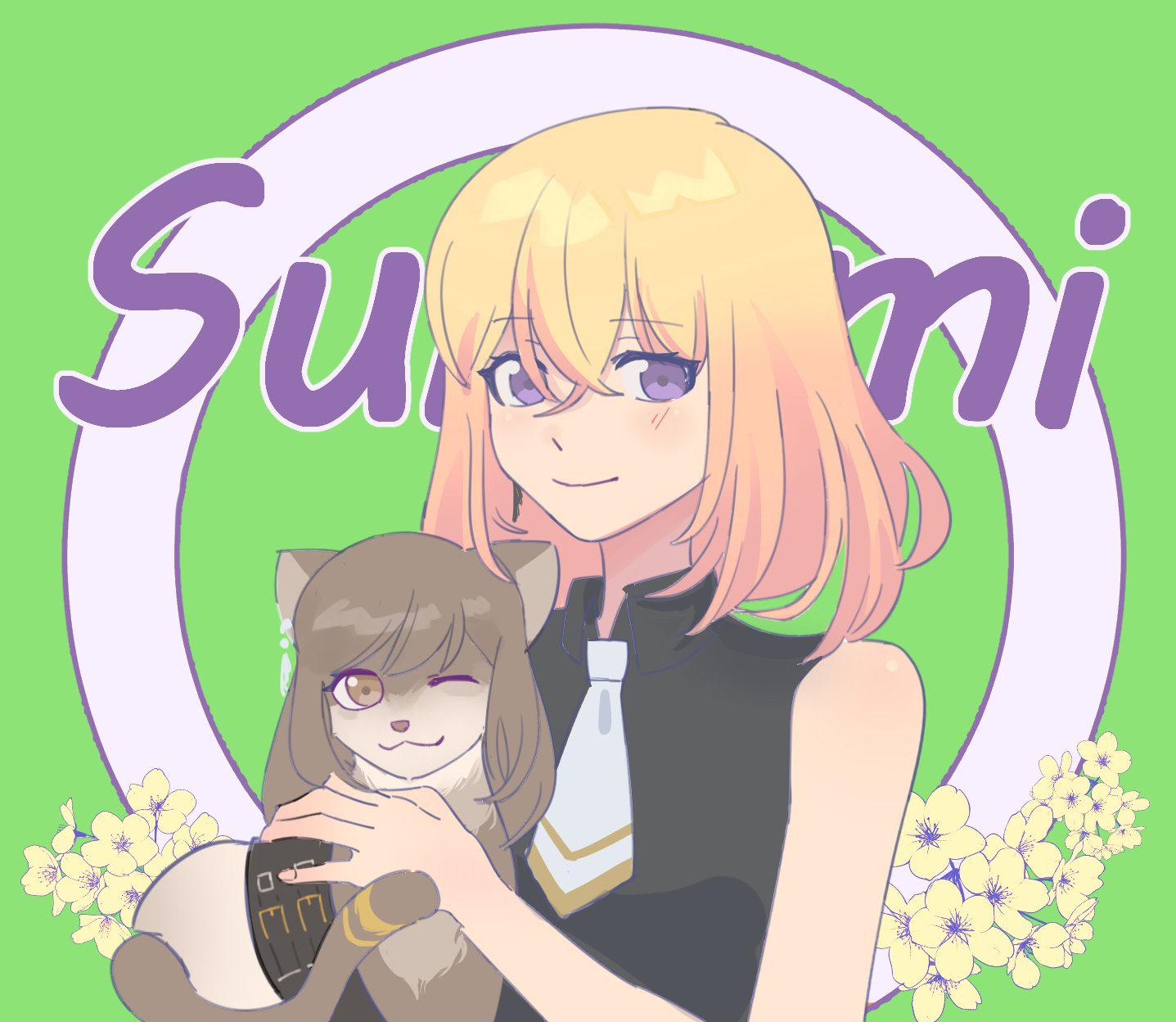 1girl animal animalization bang_dream! bang_dream!_it's_mygo!!!!! black_shirt blonde_hair blush brown_cat brown_eyes cat character_name closed_mouth collared_shirt flower green_background highres holding holding_animal holding_cat looking_at_viewer medium_hair necktie purple_eyes shirt sleeveless sleeveless_shirt smile solo sumita_mana takechi63 upper_body white_necktie yellow_flower