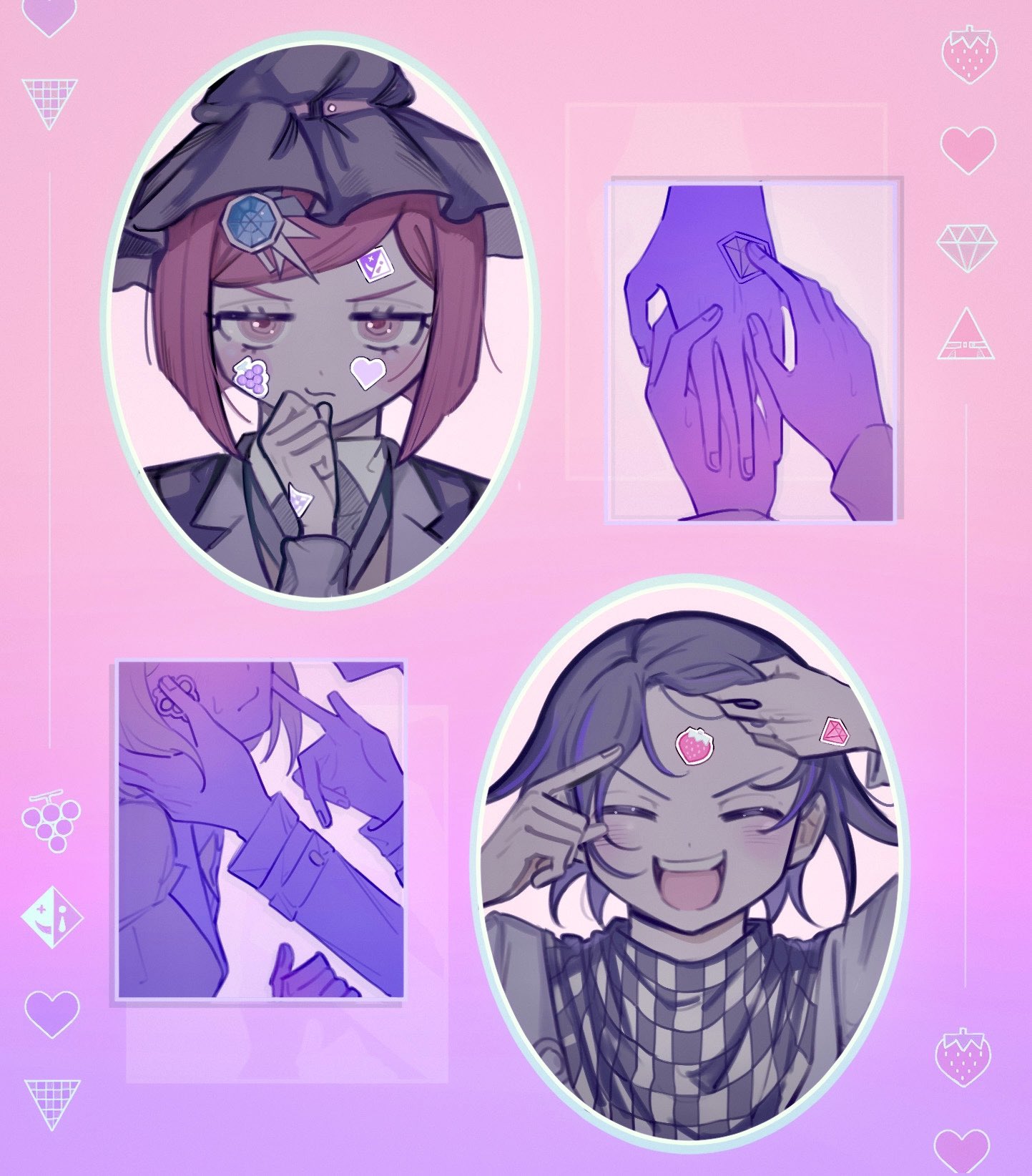 1boy 1girl black_jacket blush checkered_clothes checkered_scarf closed_eyes collared_shirt danganronpa_(series) danganronpa_v3:_killing_harmony eyelashes flipped_hair gradient_background hair_between_eyes hair_ornament happy hat highres holding_hands jacket long_sleeves looking_at_viewer morning_(d0nteat) oma_kokichi open_mouth pink_background purple_background purple_hair red_eyes red_hair scarf school_uniform shirt short_hair simple_background smile sticker sticker_on_face two-tone_scarf witch_hat yumeno_himiko