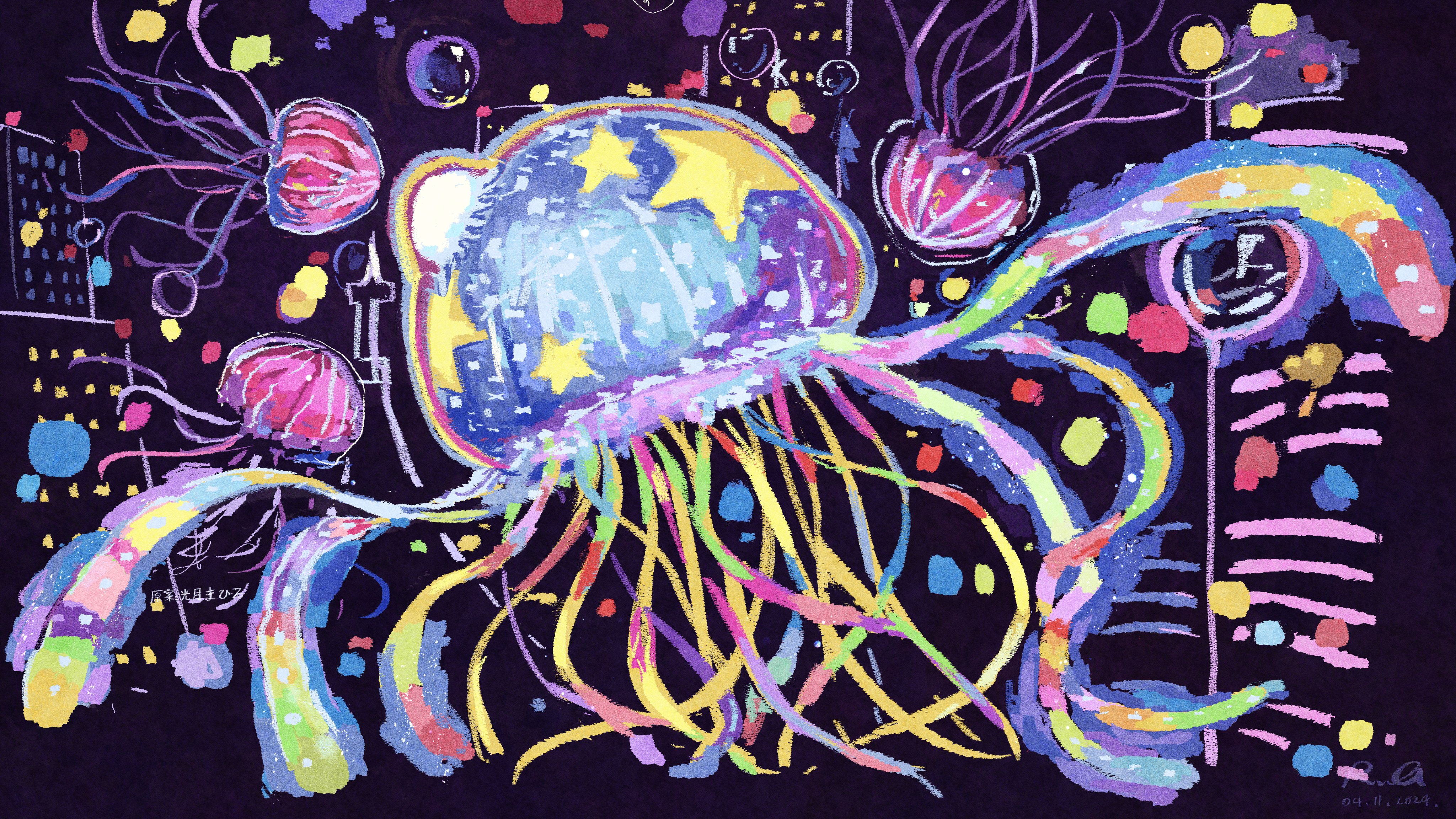 absurdres character_name clip_studio_paint_(medium) colorful commentary dated english_commentary highres jellyfish making-of_available mural no_humans rnna signature translated yoru_no_kurage_wa_oyogenai
