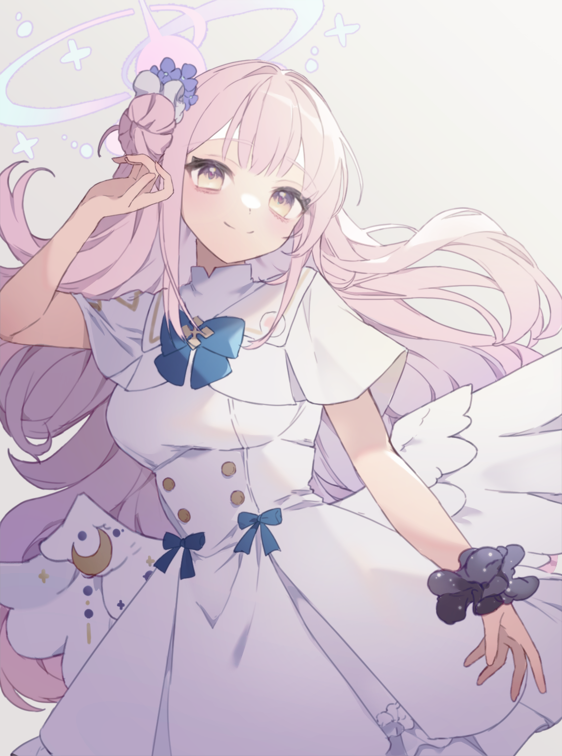 1girl angel_wings black_scrunchie blue_archive breasts capelet closed_mouth crescent crescent_pin dress feathered_wings flower hair_bun hair_flower hair_ornament halo highres large_breasts long_hair looking_at_viewer mika_(blue_archive) pink_hair pink_halo purple_flower re_re_merry scrunchie single_side_bun smile solo white_capelet white_dress white_wings wings wrist_scrunchie yellow_eyes