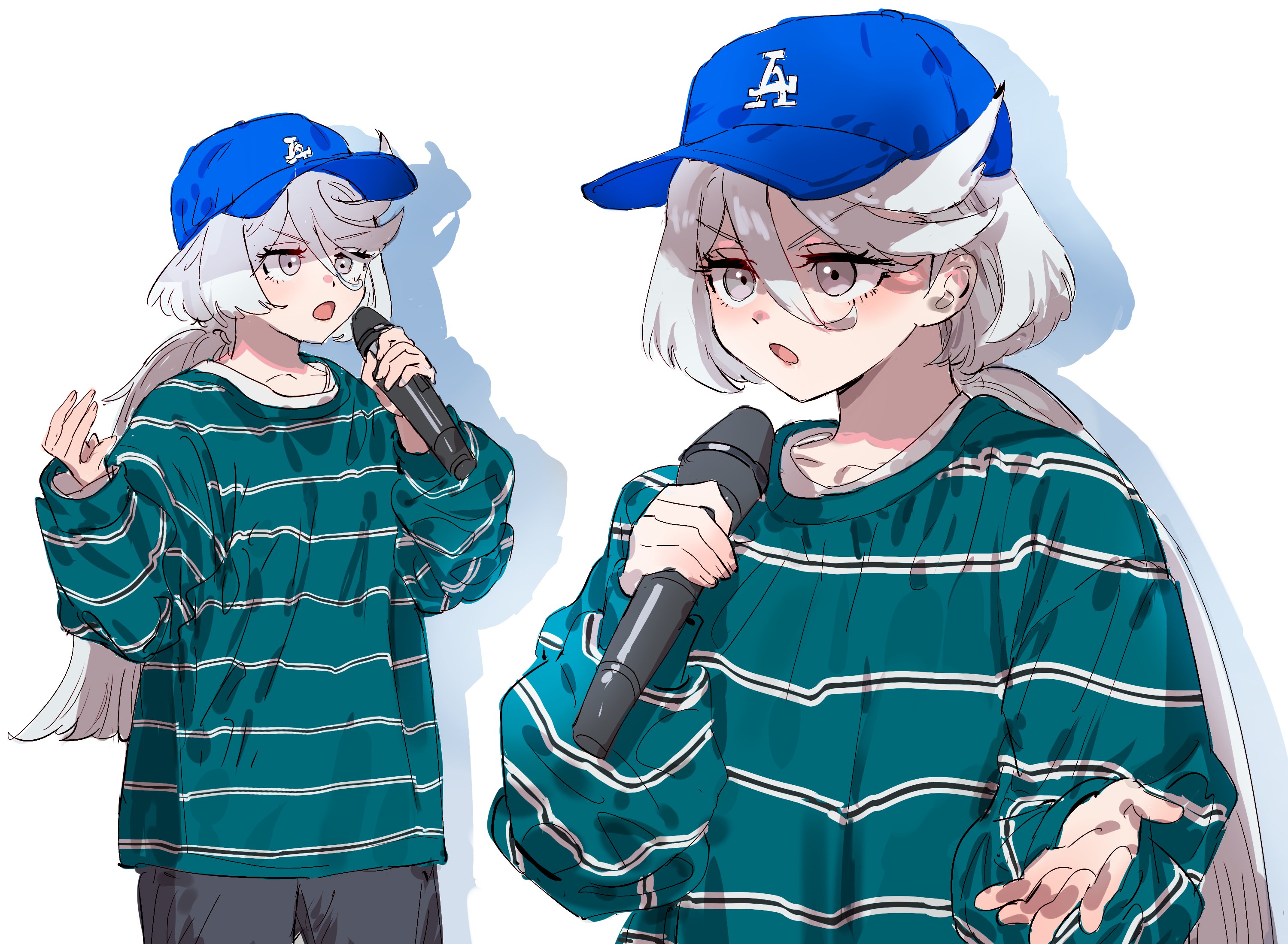 1girl alternate_costume baseball_cap belletaku blue_hat cosplay green_shirt grey_eyes grey_hair gundam gundam_suisei_no_majo hair_between_eyes hat highres holding holding_microphone long_hair long_sleeves los_angeles_dodgers major_league_baseball microphone min_hee-jin min_hee-jin_(cosplay) miorine_rembran multiple_views open_mouth real_life shadow shirt simple_background standing striped_clothes striped_shirt swept_bangs talking white_background