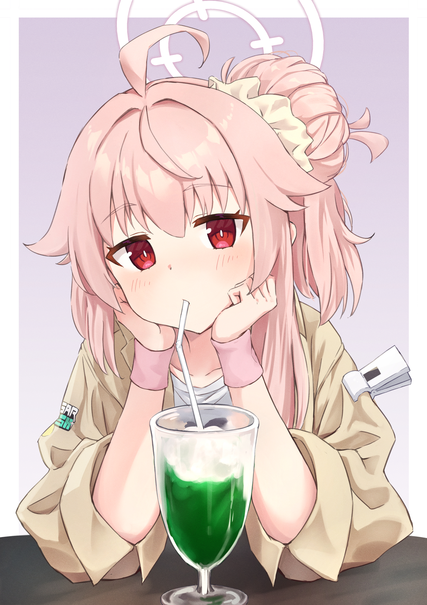 1girl ahoge blue_archive blush collarbone cream_soda cup drink drinking drinking_glass drinking_straw hair_between_eyes halo highres jacket long_hair matsu520 natsu_(band)_(blue_archive) natsu_(blue_archive) official_alternate_costume open_clothes open_jacket pink_hair pink_halo red_eyes shirt three-quarter_sleeves solo white_shirt yellow_jacket