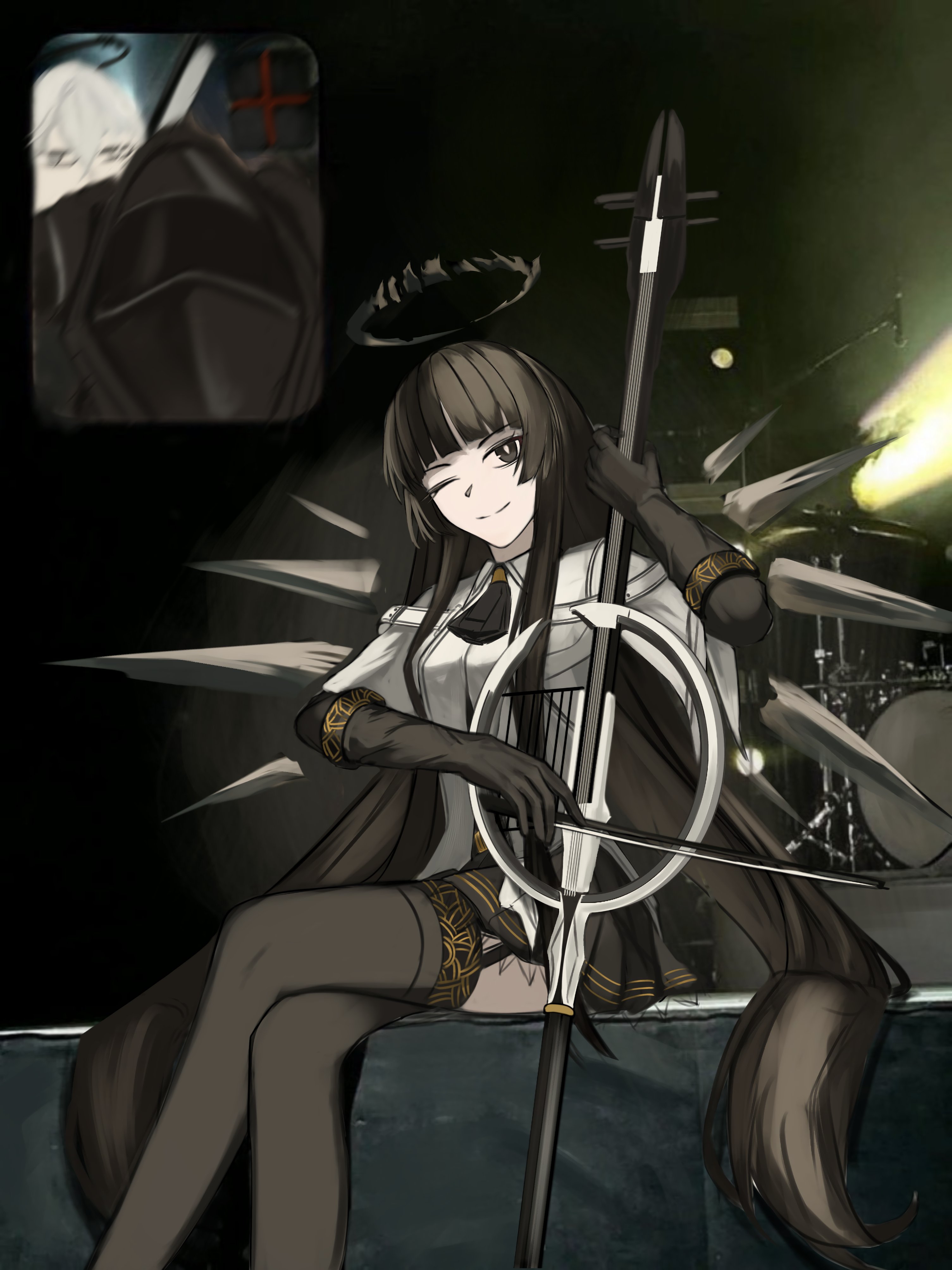 1boy 1girl 1other ;) absurdres ambiguous_gender arknights ascot barach black_ascot black_eyes black_gloves black_hair black_halo black_skirt black_thighhighs black_wings blunt_bangs blurry bow_(music) breasts bright_pupils broken_halo cello closed_mouth collared_jacket commentary concert dark_halo detached_wings doctor_(arknights) drum drum_set energy_wings executor_(arknights) fan_screaming_at_madison_beer_(meme) feet_out_of_frame from_side gloves halo hand_up highres hime_cut holding holding_bow_(music) holding_instrument inset instrument jacket layered_sleeves long_hair long_sleeves looking_at_viewer looking_to_the_side medium_breasts meme miniskirt music one_eye_closed pale_skin photo-referenced photo_background playing_instrument pleated_skirt short-sleeved_jacket short_over_long_sleeves short_sleeves sidelocks sitting skirt smile solo_focus stage stage_lights straight_hair strap thighhighs very_long_hair virtuosa_(arknights) white_jacket white_pupils wide_sleeves wing_collar wings zettai_ryouiki