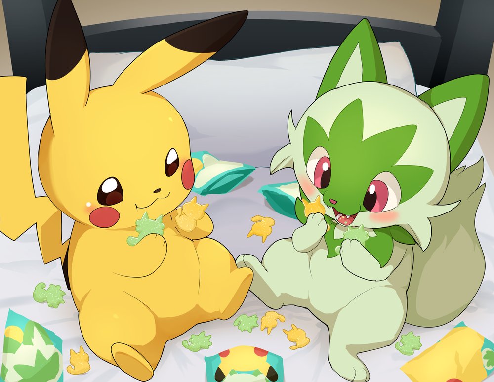 animal_focus bed blush brown_eyes candy cat eating fang food gen_1_pokemon manmosu_marimo nintendo no_humans open_mouth pikachu pillow pink_eyes pokemon pokemon_(creature) sitting smile sprigatito tongue