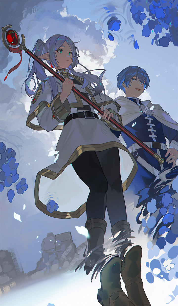 1boy 1girl belt black_belt black_pantyhose blue_flower blue_hair blue_tunic boots brown_footwear cape capelet closed_mouth cloud commentary_request cumulonimbus_cloud dress flower frieren grey_hair hand_on_own_hip highres holding holding_staff long_hair looking_at_another open_mouth outdoors pantyhose pointy_ears reflection sanng short_hair smile sousou_no_frieren staff standing tunic twintails white_cape white_capelet white_dress