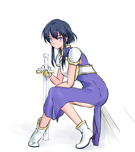 1girl armor black_hair boots breastplate china_dress chinese_clothes dress fermelle fire_emblem fire_emblem:_genealogy_of_the_holy_war holding holding_sword holding_weapon larcei_(fire_emblem) looking_at_viewer nintendo planted planted_sword planted_weapon purple_eyes short_hair shoulder_armor sidelocks simple_background sitting solo sword weapon white_background