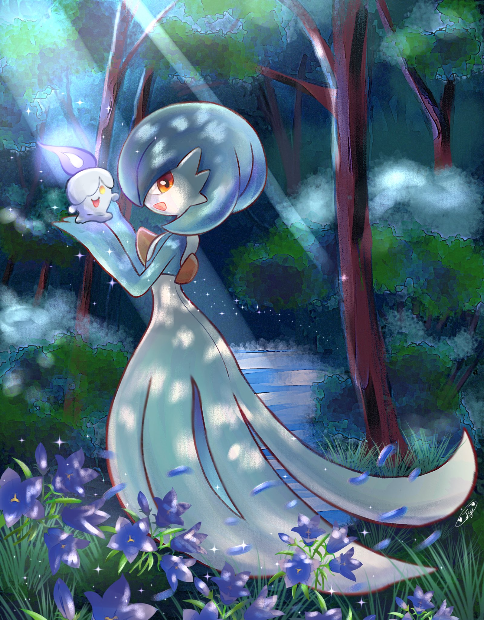 alternate_color blue_hair bob_cut colored_skin dress falling_petals fire flower forest from_side gardevoir gen_3_pokemon gen_5_pokemon highres krystalstar70 litwick looking_at_viewer multicolored_skin nature nintendo open_mouth orange_eyes petals pokemon pokemon_(creature) shiny_pokemon signature smile two-tone_skin white_dress white_skin yellow_eyes