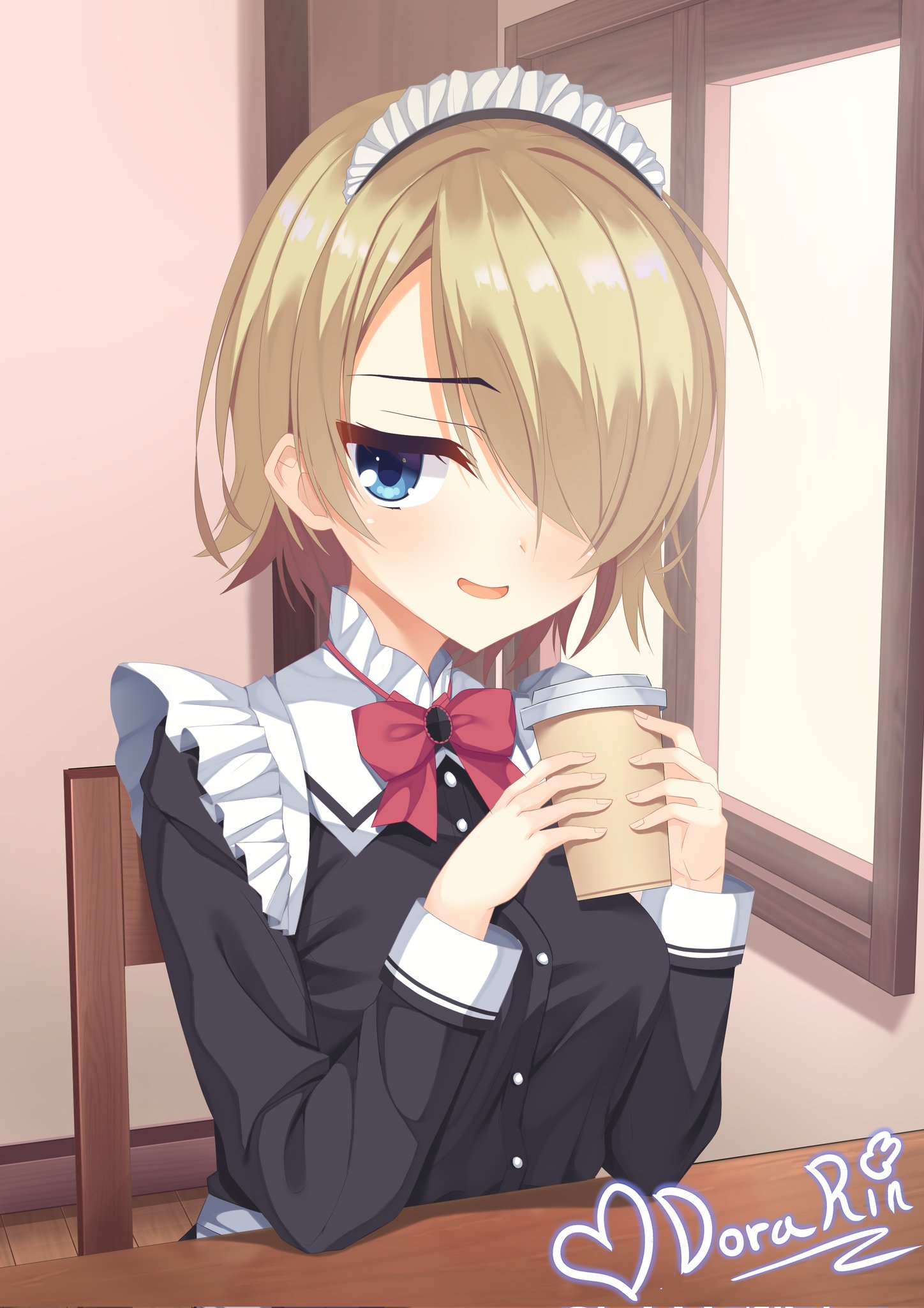 1girl apron black_shirt blue_eyes blush borrowed_character bow bowtie breasts chair commentary commission cup disposable_cup english_commentary hair_over_one_eye hands_up heart highres holding holding_cup holydora indoors jitome light_brown_hair long_bangs long_sleeves looking_at_viewer maid maid_headdress medium_breasts on_chair one_eye_covered open_mouth original red_bow red_bowtie shirt short_hair signature sitting smile smug solo upper_body white_apron