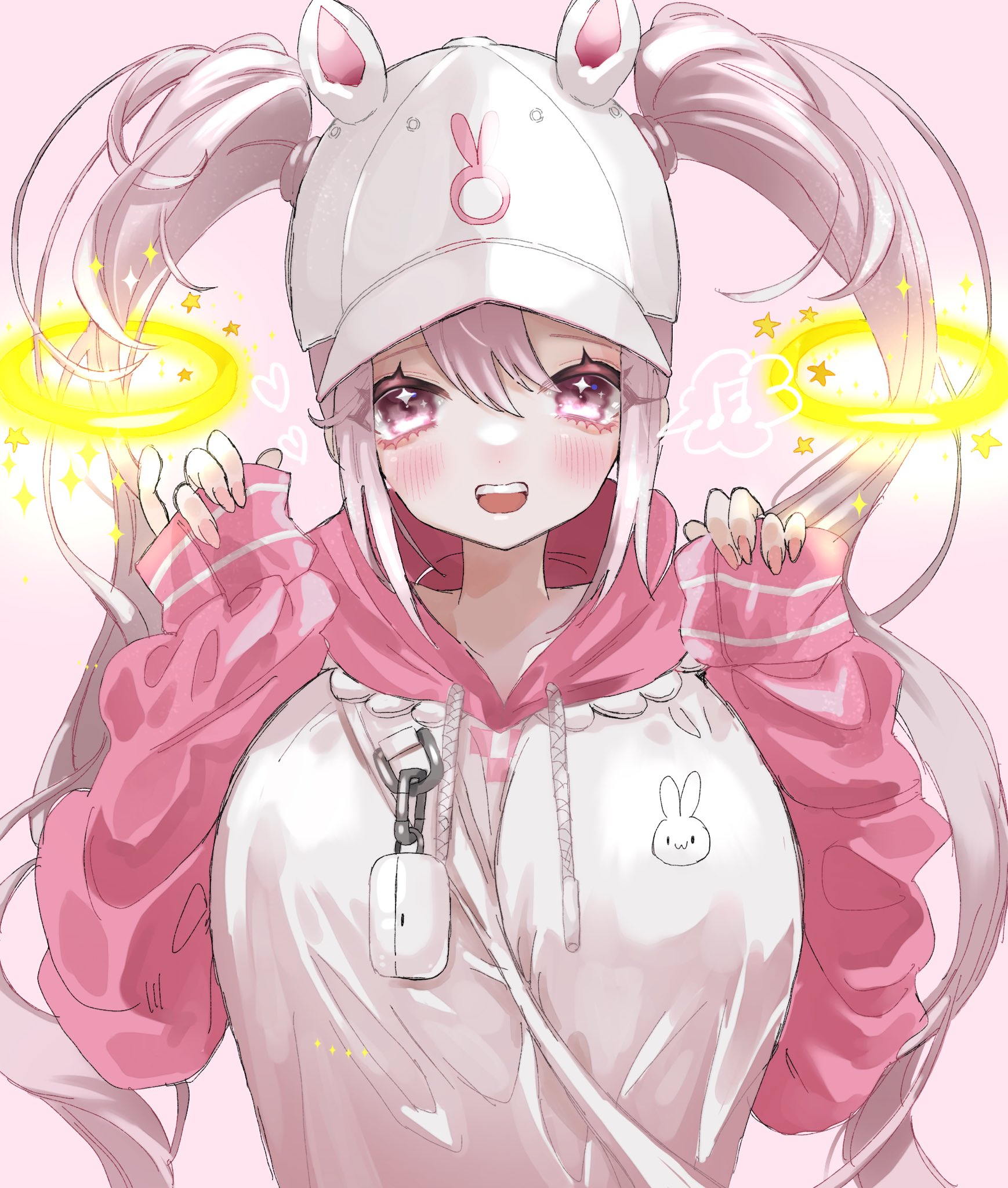 1girl :d alice_(nikke) alice_(sweet_home)_(nikke) animal_ear_headwear animal_ears animal_print baseball_cap blush breasts clothes_writing fake_animal_ears floating_headgear goddess_of_victory:_nikke hair_between_eyes hair_through_headwear hat heart highres hood hood_down hoodie large_breasts long_hair musical_note nail_polish official_alternate_costume open_mouth pink_eyes pink_hair pink_hoodie pink_nails pink_sleeves rabbit_print sidelocks smile solo spoken_musical_note twintails two-tone_hoodie uniofthedead white_hoodie