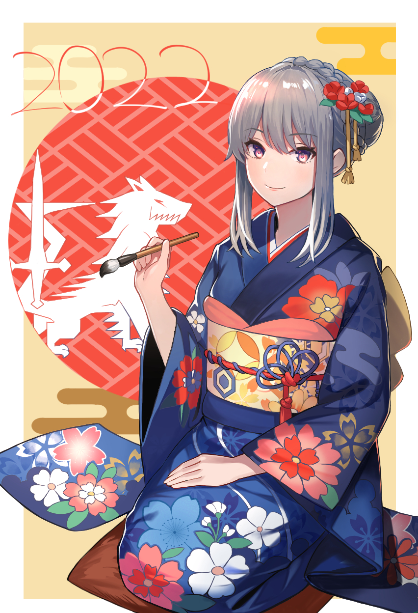 1girl 2022 alternate_costume alternate_hairstyle blue_kimono braid chinese_zodiac commentary crown_braid final_fantasy final_fantasy_brave_exvius floral_print floral_print_kimono flower furisode glaciela_wezette_(war_of_the_visions:_final_fantasy_brave_exvius) grey_hair hair_flower hair_ornament happy_new_year highres hirono_(hxze4434) holding japanese_clothes kimono light_blush long_hair long_sleeves looking_at_viewer new_year obi print_kimono red_eyes sash seiza sidelocks sitting solo war_of_the_visions:_final_fantasy_brave_exvius wide_sleeves year_of_the_tiger