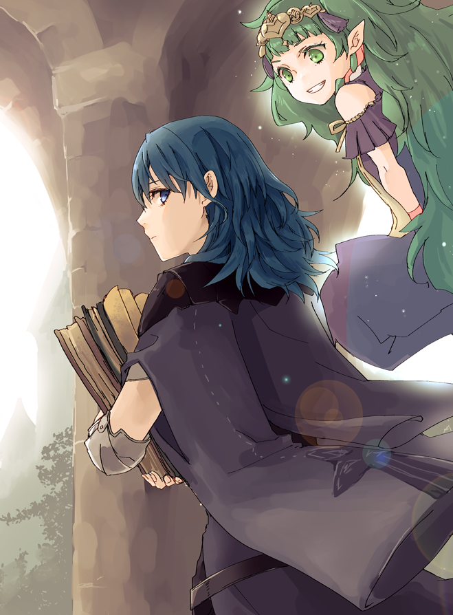 2girls armor black_cape blue_hair book female_byleth_(fire_emblem) cape closed_mouth commentary_request fire_emblem fire_emblem:_three_houses floating green_eyes green_hair grin holding holding_book long_hair looking_at_viewer multiple_girls nintendo pointy_ears profile purple_eyes robaco smile sothis_(fire_emblem) teeth twintails