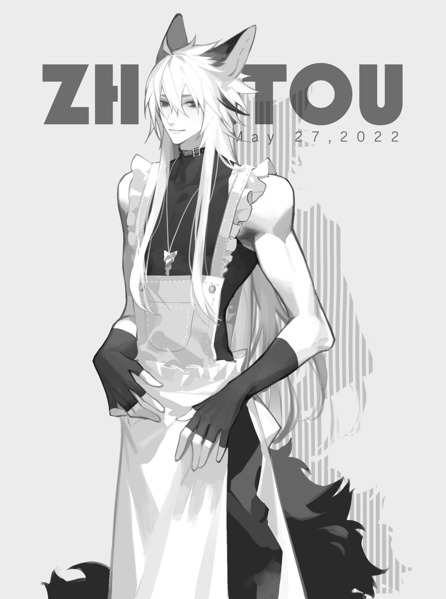 1boy animal_ears apron belt_buckle belt_collar buckle character_name check_copyright chinese_commentary closed_mouth collar commentary_request copyright_request cowboy_shot dated drop_shadow fingerless_gloves frilled_apron frills gloves grey_background greyscale highres jewelry light_smile long_hair monochrome necklace original pants pendant pocket ribbon-trimmed_apron ribbon_trim shirt sidelocks simple_background sleeveless sleeveless_shirt solo straight_hair tail toned toned_male tooth_necklace very_long_hair wolf_ears wolf_tail zzennn