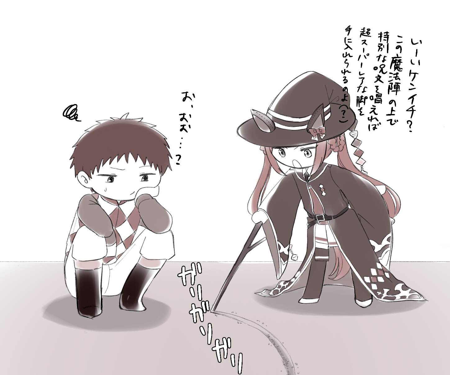 1boy 1girl animal_ears boots chibi greyscale hat head_rest highres holding holding_stick horse_ears horse_girl horse_tail ikezoe_ken'ichi long_hair long_sleeves monochrome poteo_(poteo_mot) real_life simple_background sitting stick sweep_tosho_(platanus_witch)_(umamusume) sweep_tosho_(umamusume) tail thighhighs translation_request twintails umamusume very_long_hair wide_sleeves witch_hat