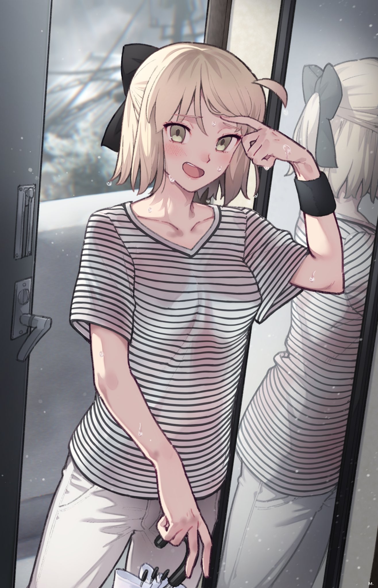 1girl ahoge blonde_hair blush bow breasts fate/grand_order fate_(series) hair_bow highres koha-ace looking_at_viewer medium_breasts mitsurugi_sugar okita_souji_(fate) okita_souji_(koha-ace) open_mouth short_hair short_sleeves smile solo yellow_eyes