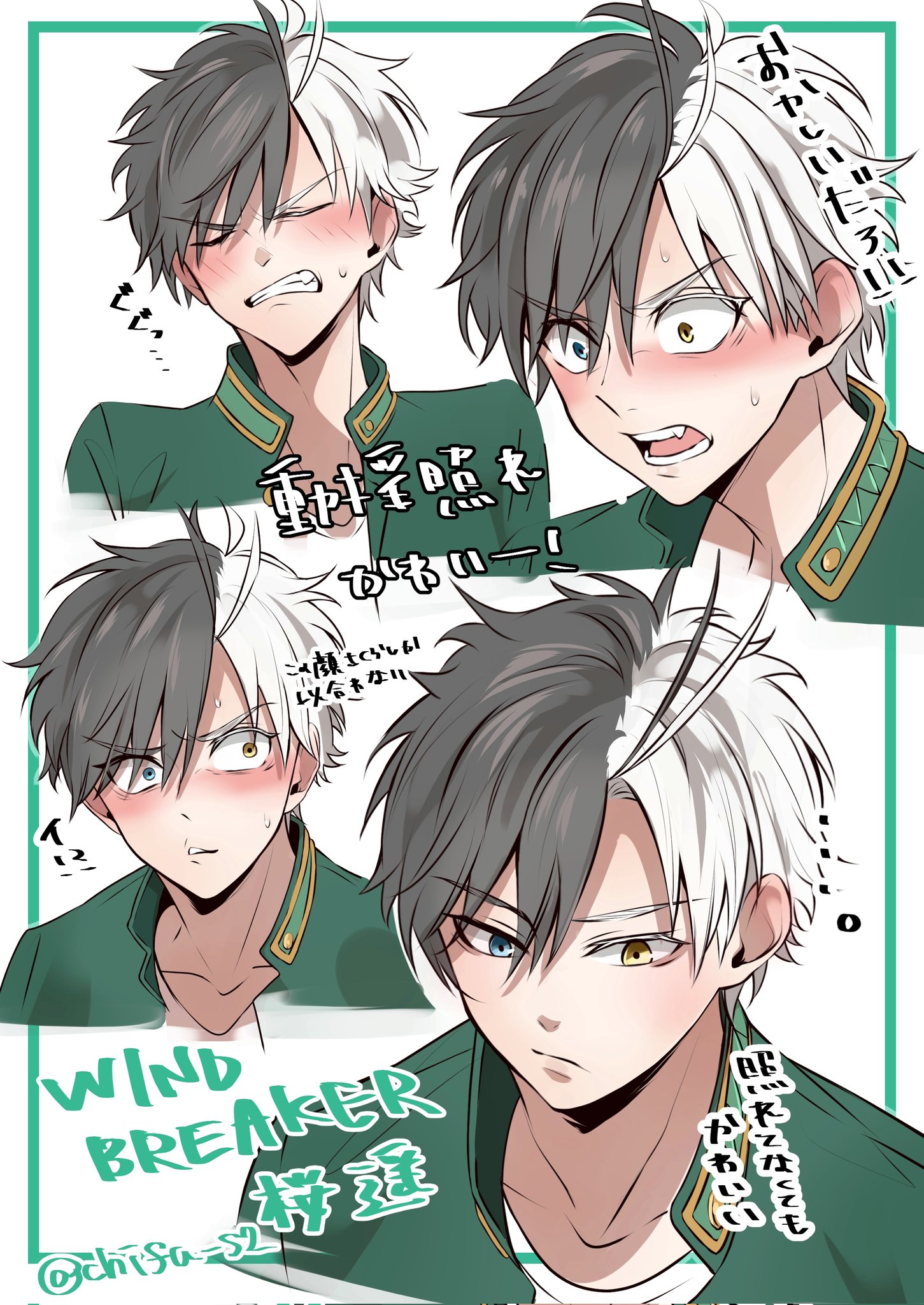 1boy black_hair blush chifu_s2 cropped_torso hair_between_eyes heterochromia highres jacket male_focus multicolored_hair multiple_views open_mouth popped_collar sakura_haruka_(wind_breaker) school_uniform shirt short_hair split-color_hair tsundere undershirt v-shaped_eyebrows white_hair white_shirt wind_breaker_(nii_satoru)