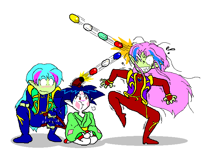 1boy 2girls ail_(sailor_moon) alien an_(sailor_moon) angry artist_request ball bishoujo_senshi_sailor_moon bishoujo_senshi_sailor_moon_r bishoujo_senshi_sailor_moon_supers bodysuit breasts brother_and_sister closed_mouth colored_skin curvy demon_girl full_body green_skin hair_between_eyes japanese_clothes lemures_(sailor_moon) long_hair long_sleeves looking_at_another multicolored_hair multiple_girls no_humans pain piercing pointy_ears ponko_(sailor_moon) red_eyes sharp_teeth shiny_clothes siblings sitting small_breasts smile squatting surprised tail teeth two-tone_hair usukage-do_maina-ya very_long_hair vest white_background wide_hips