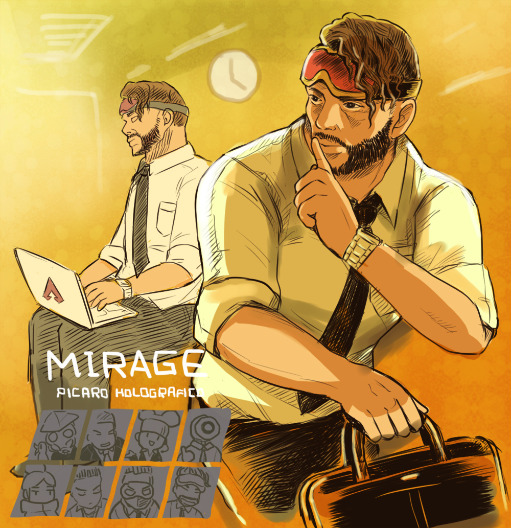 1boy alternate_costume analog_clock apex_legends bag bangalore_(apex_legends) black_eyes black_pants bloodhound_(apex_legends) brown_hair caustic_(apex_legends) character_name clock collared_shirt computer facial_hair finger_to_mouth gibraltar_(apex_legends) goatee goggles goggles_on_head head_tilt holding holding_bag laptop lifeline_(apex_legends) male_focus mirage_(apex_legends) pants pathfinder_(apex_legends) rii_(metro_electro) shirt shushing smile watch white_shirt wraith_(apex_legends) wristwatch