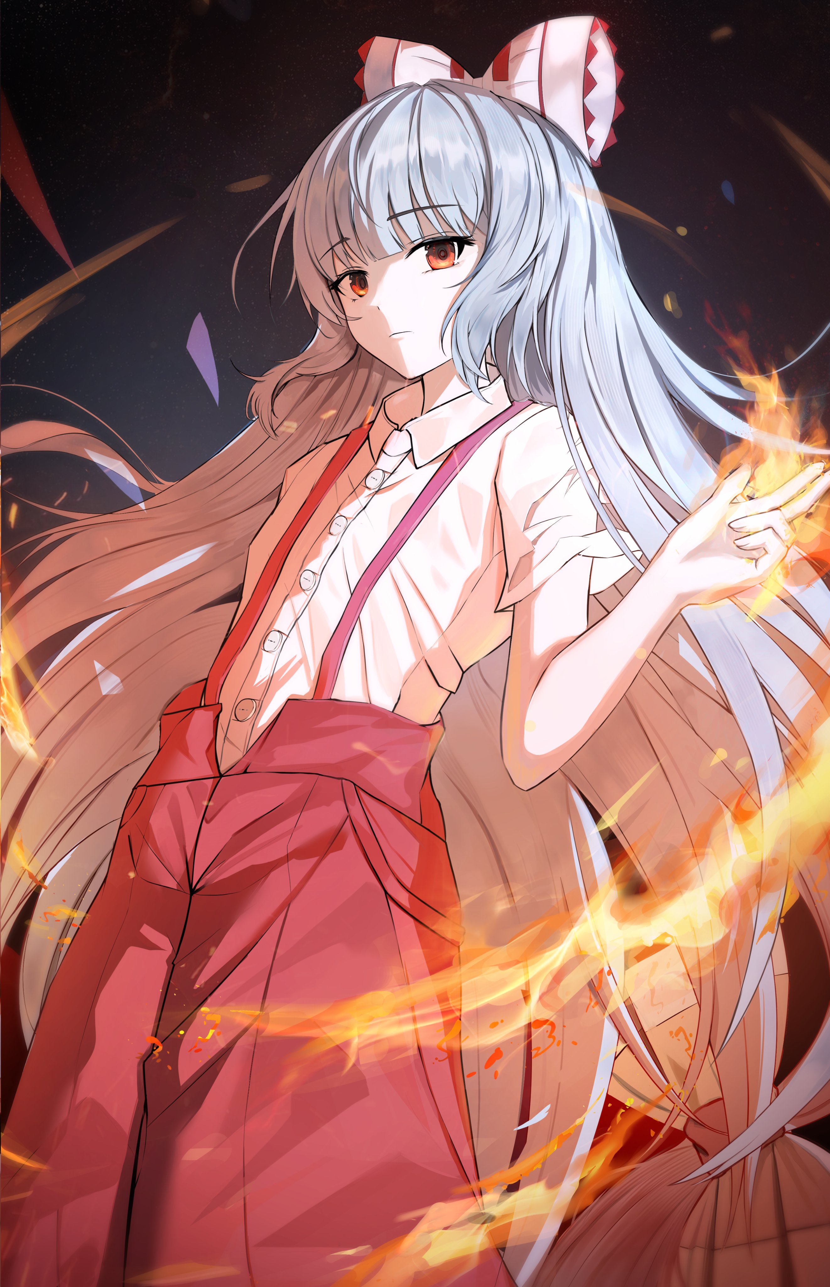 1girl absurdres bow buttons closed_mouth collared_shirt commentary_request dark_background dress_shirt expressionless feet_out_of_frame fire fujiwara_no_mokou grey_hair hair_bow hand_up highres long_hair looking_at_viewer orange_eyes pants pyrokinesis red_bow red_pants rei_yagami shirt short_sleeves solo standing suspenders touhou very_long_hair white_bow white_shirt