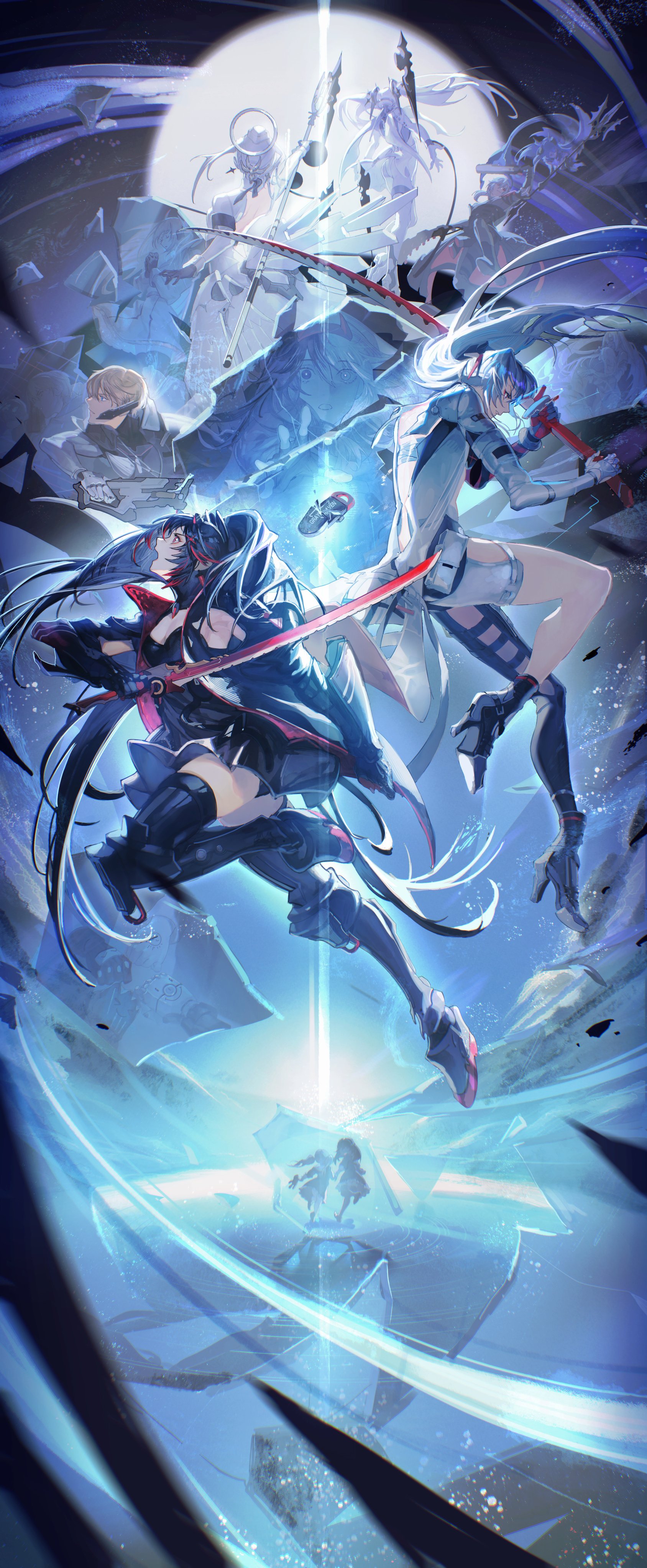 2boys 5girls absurdres alpha:_crimson_weave_(pgr) alpha_(pgr) angel_wings armpits asymmetrical_legwear asymmetrical_sleeves back bare_back black_gloves black_hair black_skirt blonde_hair blue_eyes breasts broken_glass character_request check_character chrome:_arclight_(pgr) chrome_(pgr) cleavage coat coattails dress glass gloves gun hair_ornament halo highres holding holding_gun holding_staff holding_sword holding_weapon lamia:_lost_lullaby_(pgr) lamia_(pgr) lee:_hyperreal_(pgr) lee_(pgr) liv:_eclipse_(pgr) liv:_empyrea_(pgr) liv_(pgr) long_hair looking_ahead looking_down lucia:_lotus_(pgr) lucia:_plume_(pgr) lucia_(pgr) luna:_laurel_(pgr) luna_(pgr) mechanical_arms mechanical_hands mechanical_legs medium_breasts multicolored_hair multiple_boys multiple_girls multiple_views ponytail punishing:_gray_raven roland:_flambeau_(pgr) roland_(pgr) roland_(punishing:_gray_raven) shima_(happyhokemiday) shoulder_blades skirt staff sword tailcoat twintails very_long_hair weapon white_coat white_dress white_hair white_skirt white_sleeves wide_shot wings