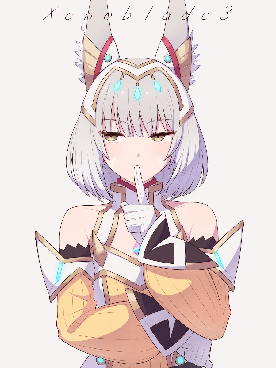 1girl animal_ear_fluff bare_shoulders cat_girl commentary_request copyright_name finger_to_mouth gloves grey_hair highres hinoyama_kou index_finger_raised looking_to_the_side medium_hair nia_(xenoblade) simple_background solo upper_body white_background white_gloves xenoblade_chronicles_(series) xenoblade_chronicles_3 yellow_eyes