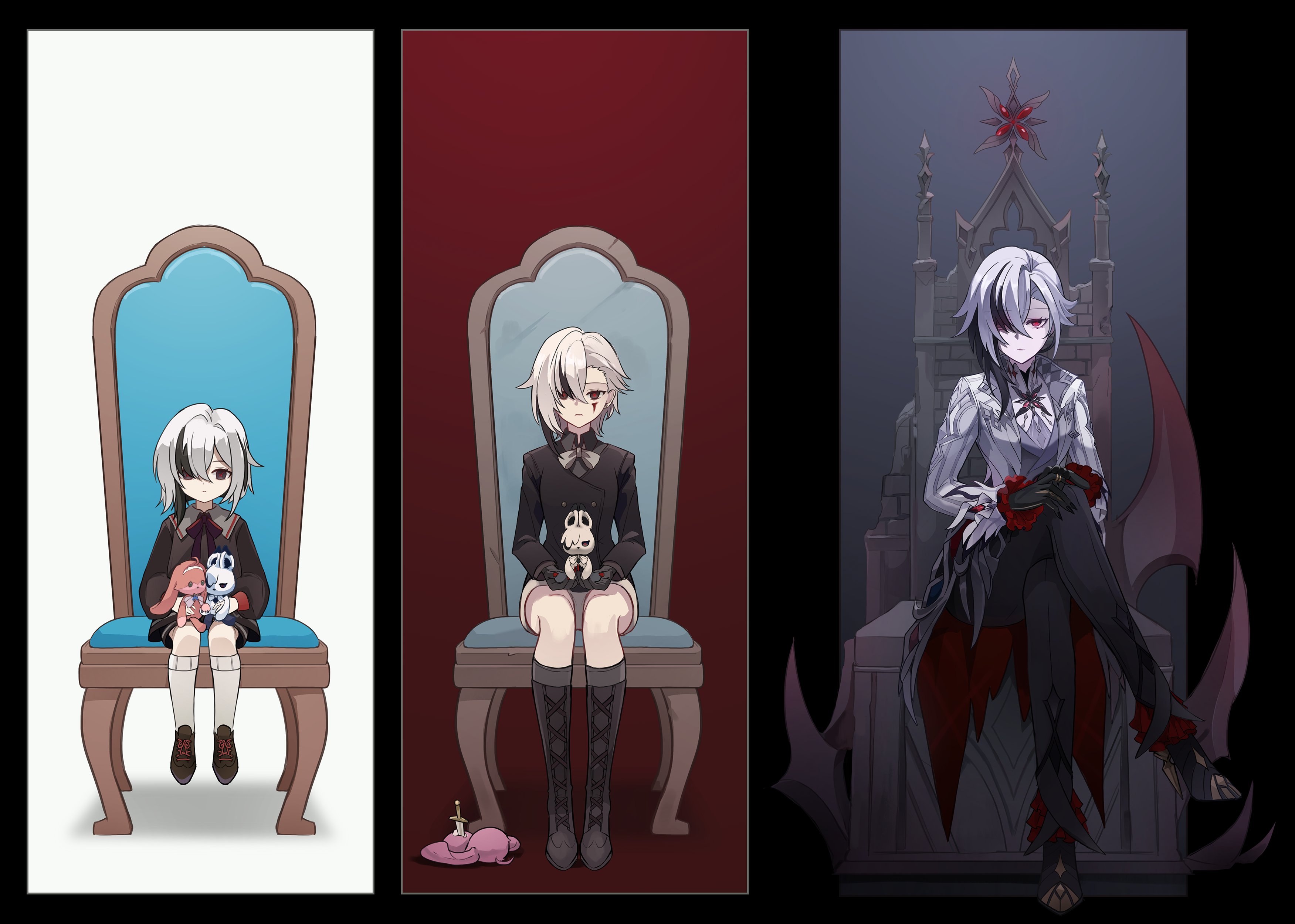 3girls absurdres age_progression aged_down arlecchino_(genshin_impact) black_border black_eyes black_footwear black_gloves black_nails black_pants black_shorts blood blood_on_face boots border bow bowtie brown_jacket chair character_doll child coat coattails collared_jacket column_lineup cross-laced_footwear crossed_legs doll expressionless frilled_sleeves frills full_body genshin_impact gloves grey_bow grey_bowtie hair_over_one_eye hand_on_own_knee highres holding holding_stuffed_toy jacket jewelry knee_boots kneehighs long_sleeves looking_at_viewer multicolored_hair multiple_girls multiple_persona on_chair on_throne one_eye_covered pants peomyu_phermu peruere_(genshin_impact) red_bow red_bowtie red_nails red_pupils ring short_hair shorts sitting socks straight-on streaked_hair stuffed_animal stuffed_rabbit stuffed_toy swept_bangs symbol-shaped_pupils tailcoat throne two-sided_fabric two-tone_hair white_coat white_hair white_shorts white_socks x-shaped_pupils