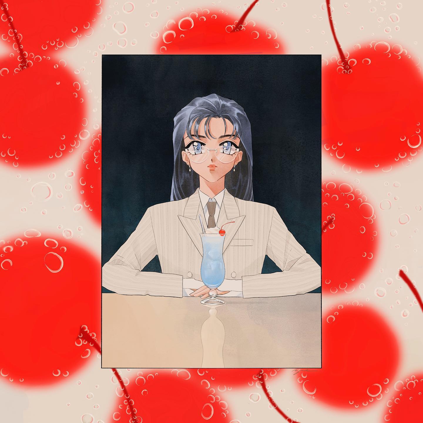 1990s_(style) 1girl black_hair blue_eyes border brown_jacket brown_necktie cherry collared_shirt commentary cub drinking_straw earrings english_commentary expressionless food fruit glasses highres jacket jewelry long_hair long_sleeves looking_at_viewer necktie original pink_lips pinstripe_jacket pinstripe_pattern retro_artstyle round_eyewear shirt sleeves_past_wrists solo straight-on white_shirt yue_(yung_n_dum_)
