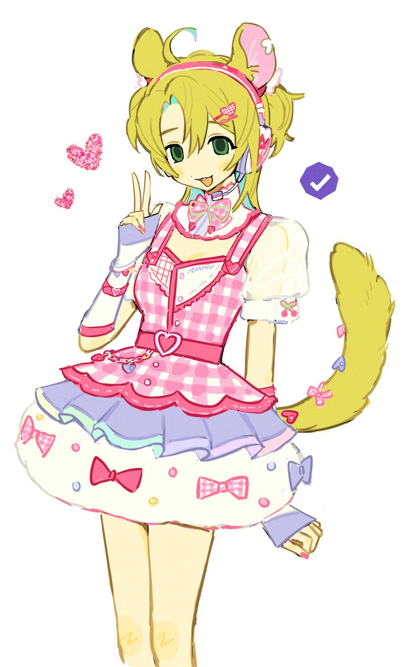 1girl animal_ears arm_warmers ashton_marten_(vtuber) belt bow buckle checkmark chinchilla_ears chinchilla_girl chinchilla_tail commentary dress dress_bow english_commentary fairy_kei green_eyes green_hair hair_ornament hairclip headphones headset heart heart-shaped_buckle heart_hair_ornament highres indie_virtual_youtuber long_hair mota_(motaberrie) nail_polish notched_ear open_mouth ribbon see-through_clothes see-through_sleeves short_sleeves smile solo tail tail_ornament tail_ribbon teeth two_side_up upper_teeth_only virtual_youtuber w yume_kawaii