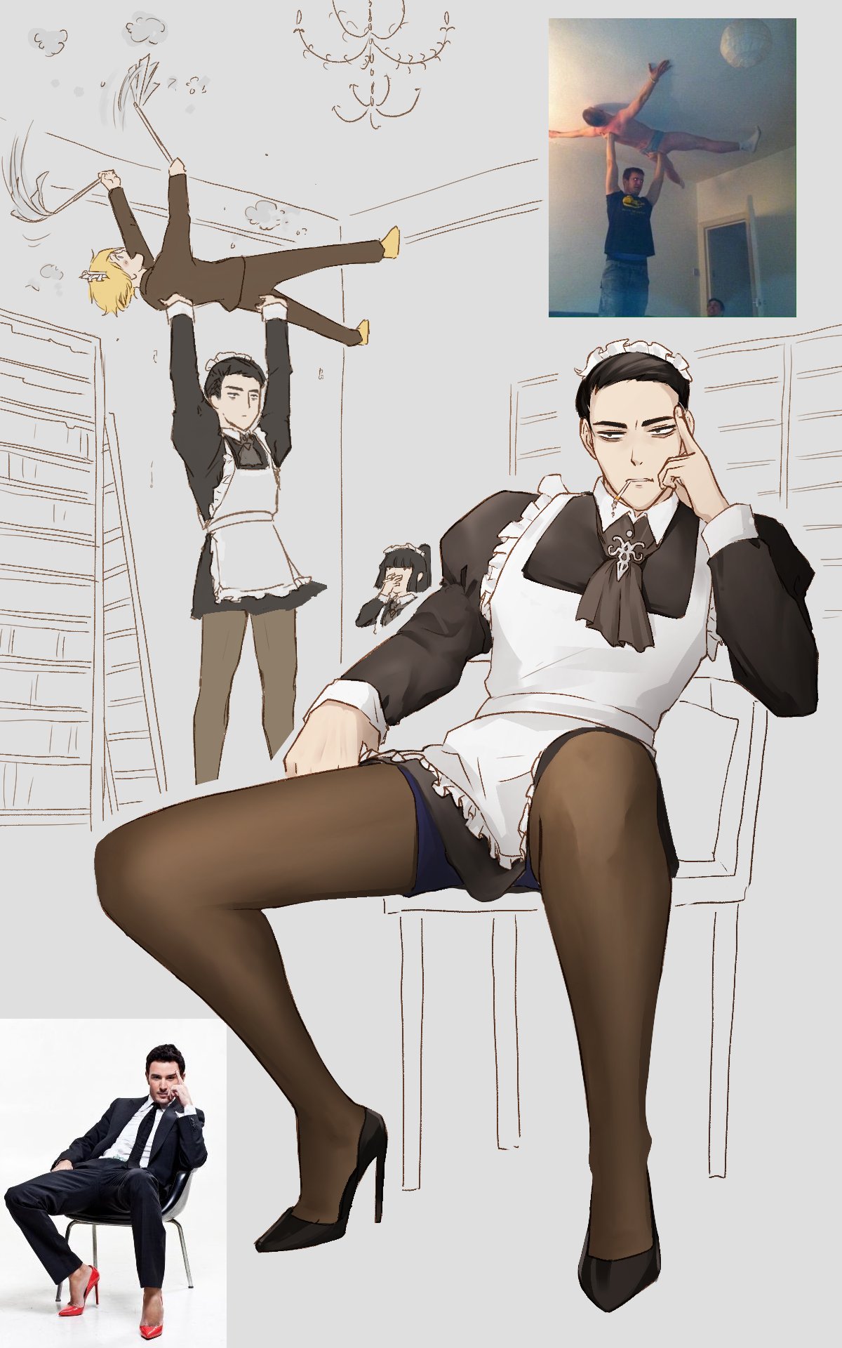 1boy alternate_costume apron arachnidlegs black_dress black_hair black_pantyhose carrying carrying_overhead carrying_person cleaning closed_mouth crossdressing crossdressing_(mtf) dress enmaided frilled_apron frilled_dress frills high_heels highres long_sleeves maid maid_apron maid_day maid_headdress male_focus male_maid meursault_(project_moon) pantyhose photo_inset project_moon puffy_sleeves reference_inset sitting spread_legs strong unamused white_apron wrist_cuffs