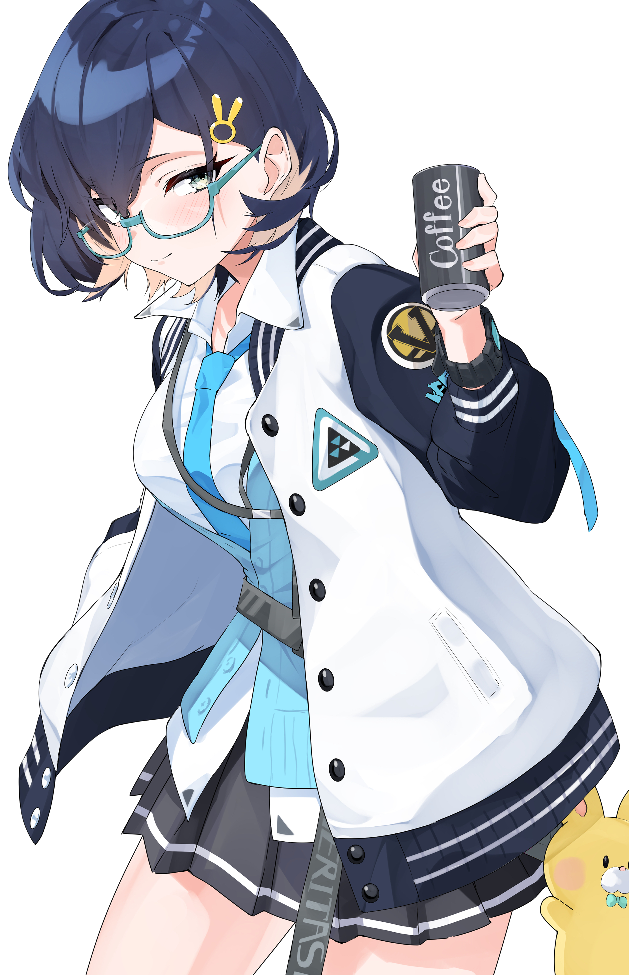 1girl absurdres black_hair black_skirt blue-framed_eyewear blue_archive blue_necktie blue_vest blush breasts can chihiro_(blue_archive) closed_mouth collared_shirt cowboy_shot glasses green_eyes highres holding holding_can isocha jacket long_sleeves medium_breasts necktie open_clothes open_jacket pleated_skirt shirt short_hair simple_background skirt smile solo vest white_background white_jacket white_shirt