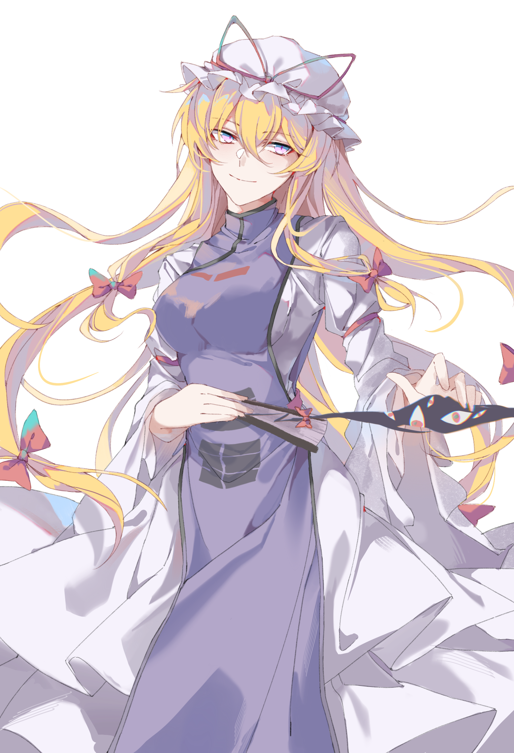 1girl absurdres blonde_hair bow breasts cowboy_shot dress gap_(touhou) hair_bow hat hat_ribbon highres jubctybn large_breasts long_hair long_sleeves looking_at_viewer mob_cap purple_dress purple_eyes purple_tabard ribbon smile solo tabard touhou trigram white_background yakumo_yukari