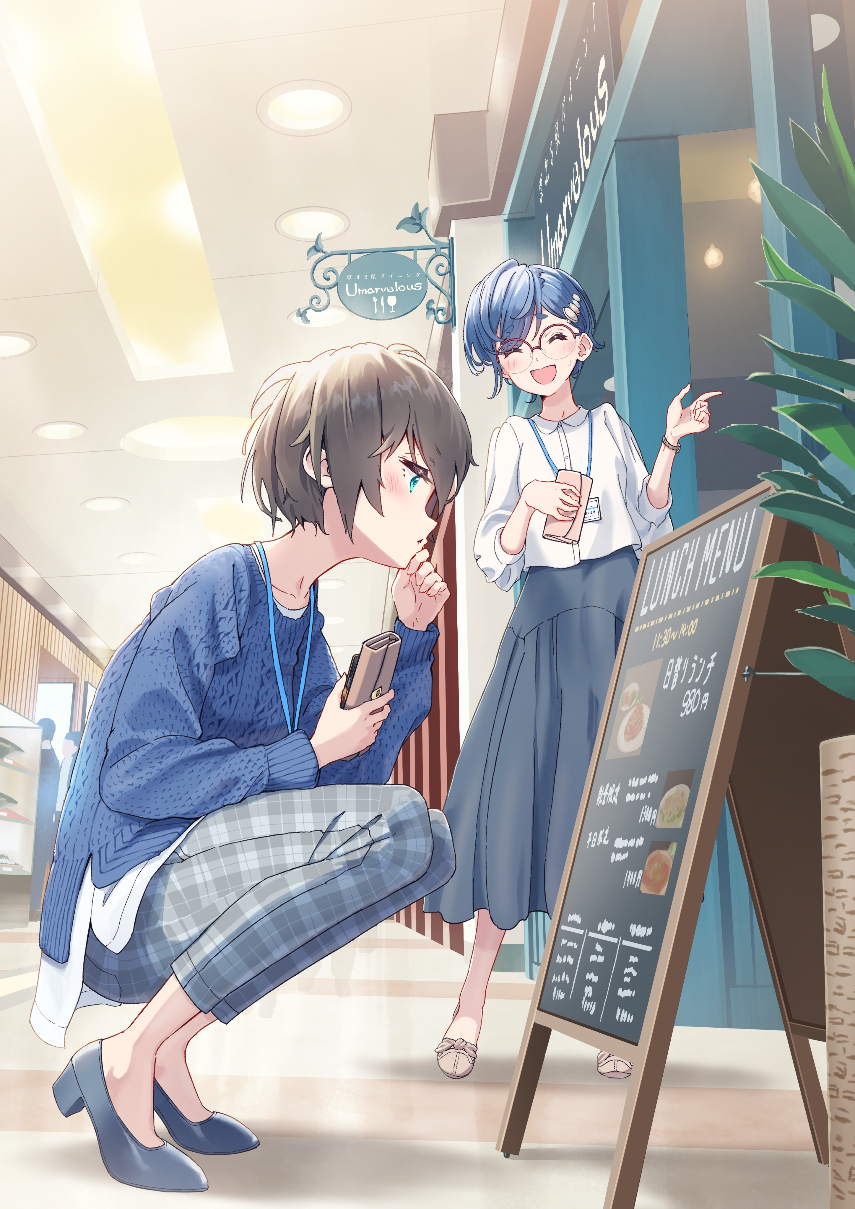 2girls absurdres blue_eyes blue_hair brown_hair clutch_purse glasses hand_on_own_chin handbag highres holding holding_wallet indoors knit_sweater menu_board michinoku_(hiking_miusan18) multiple_girls original pants plaid_clothes plaid_pants short_hair slice_of_life smile squatting sweatdrop wallet