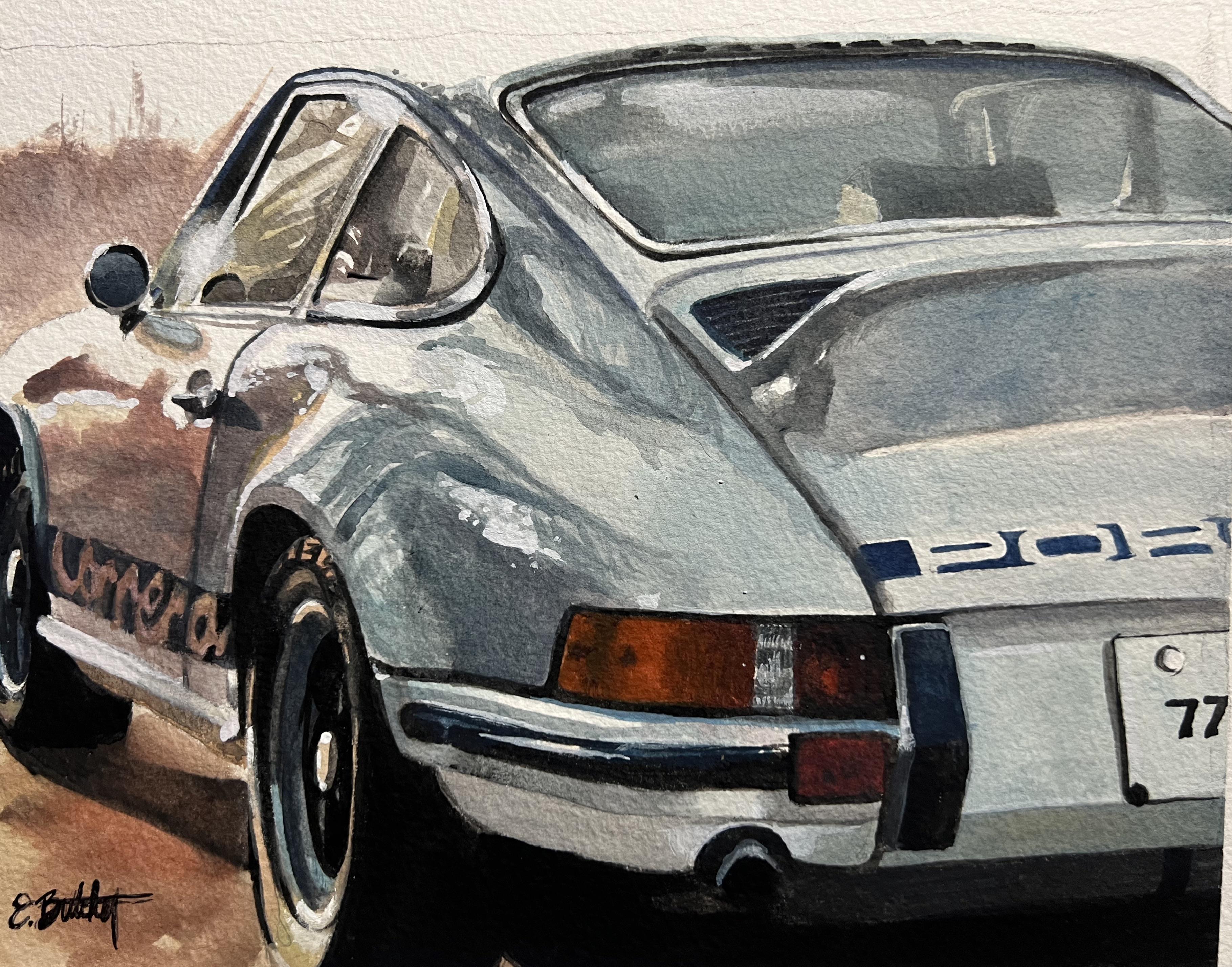 absurdres bad_id bad_reddit_id butcherbirdart car commentary english_commentary from_behind highres motor_vehicle no_humans original painting_(medium) porsche porsche_911 porsche_911_(classic) signature sports_car traditional_media vehicle_focus white_car
