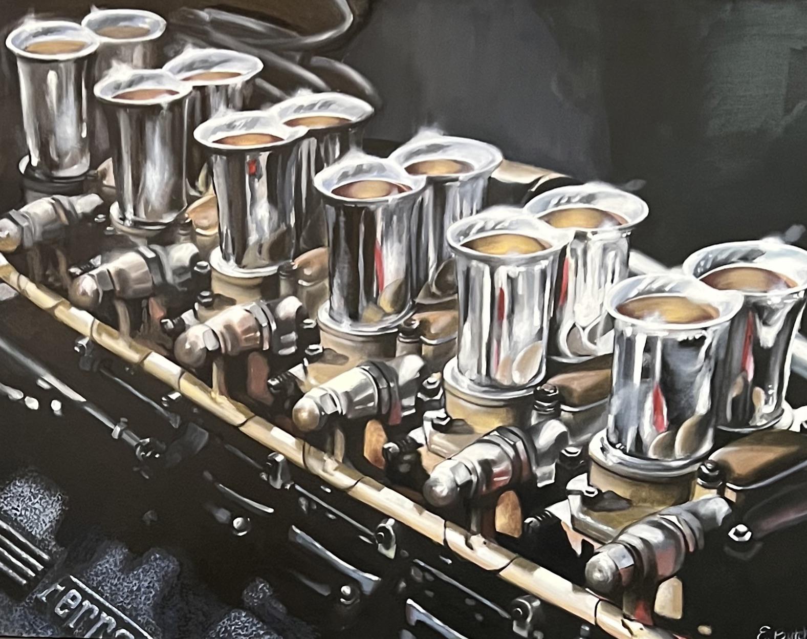 butcherbirdart close-up engine ferrari highres no_humans oil_painting_(medium) original painting_(medium) reflection signature still_life traditional_media
