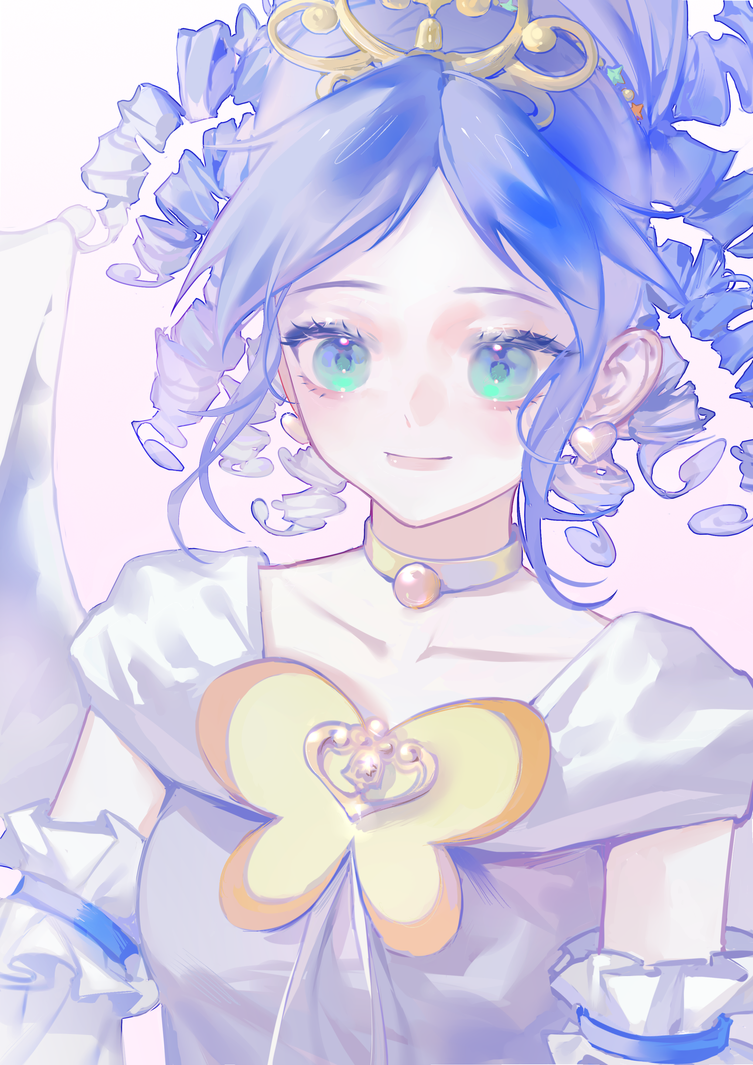1girl absurdres angel_wings aqua_eyes bell blue_garter blue_hair brooch butterfly_brooch chinese_commentary choker closed_mouth collarbone commentary_request detached_sleeves dress drill_hair earrings eyelashes frilled_garter fushigiboshi_no_futago_hime gold_tiara gradient_background green_choker heart heart_earrings highres jewelry looking_at_viewer neck_bell pink_background pink_lips ponytail princess ravenya0w0 rein_(futagohime) rein_(grand_universal_princess)_(futagohime) short_sleeves simple_background smile solo tiara upper_body white_dress white_sleeves white_wings wings