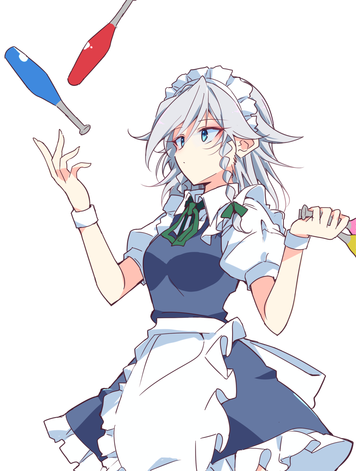 1girl apron back_bow blue_dress blue_eyes blue_skirt bow breasts collared_shirt commentary_request dress frilled_apron frilled_dress frills green_ribbon grey_hair hair_ribbon highres ichimura_kanata izayoi_sakuya juggling_club neck_ribbon puffy_short_sleeves puffy_sleeves ribbon shirt short_sleeves simple_background skirt small_breasts solo touhou undershirt waist_apron waist_bow white_apron white_background white_bow white_wrist_cuffs wrist_cuffs