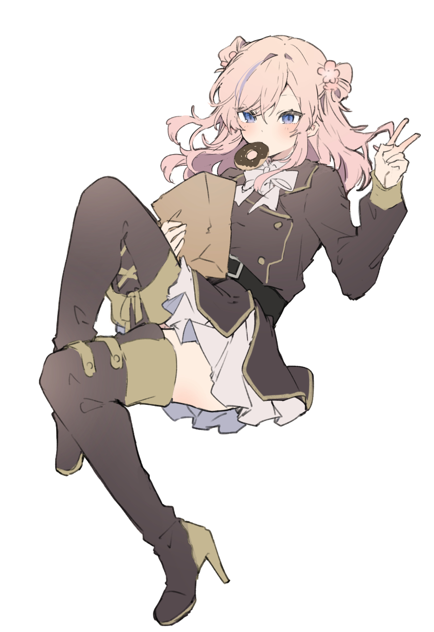 1girl bag black_jacket boots double_bun eating food_in_mouth hair_bun high_heel_boots high_heels highres ikeuchi_tanuma jacket looking_at_viewer multicolored_hair original paper_bag purple_eyes rije_(ikeuchi_tanuma) simple_background solo streaked_hair thigh_boots v white_background