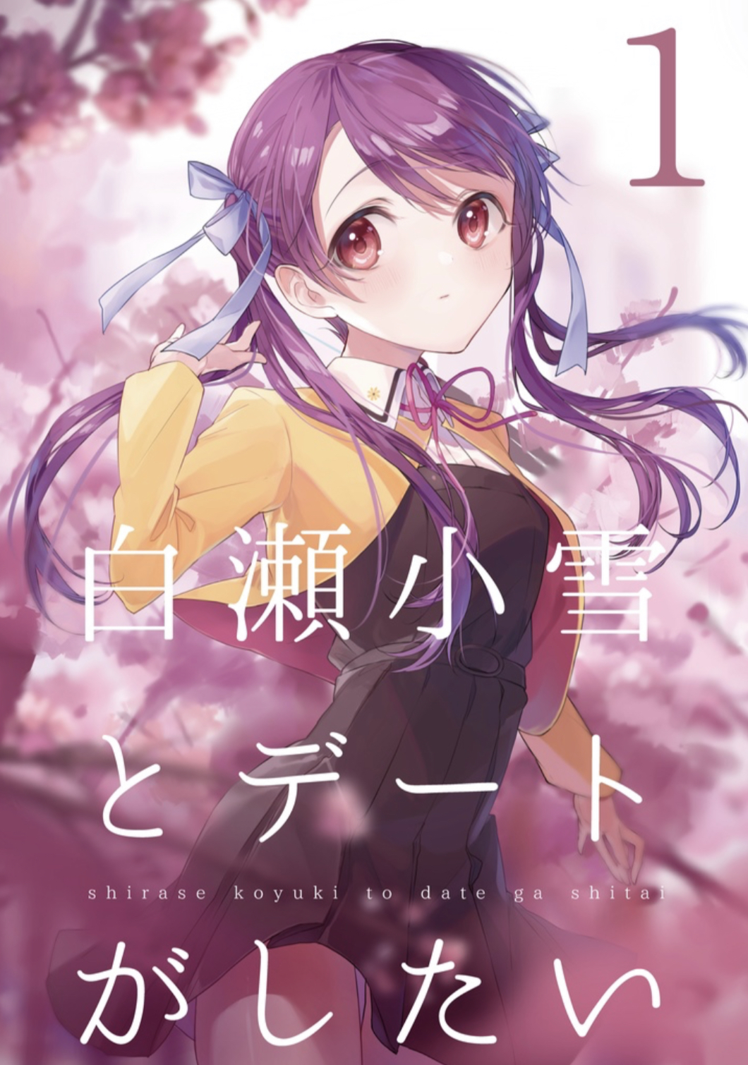 1girl black_dress blue_ribbon character_name collared_shirt cover cover_page cropped_jacket dress hair_ribbon hand_up highres jacket koyoru-f long_hair looking_to_the_side love_live! love_live!_school_idol_festival neck_ribbon pinafore_dress pink_ribbon pleated_dress purple_hair red_eyes ribbon romaji_text shirase_koyuki shirt sleeveless sleeveless_dress solo standing swept_bangs tree twintails white_shirt yellow_jacket