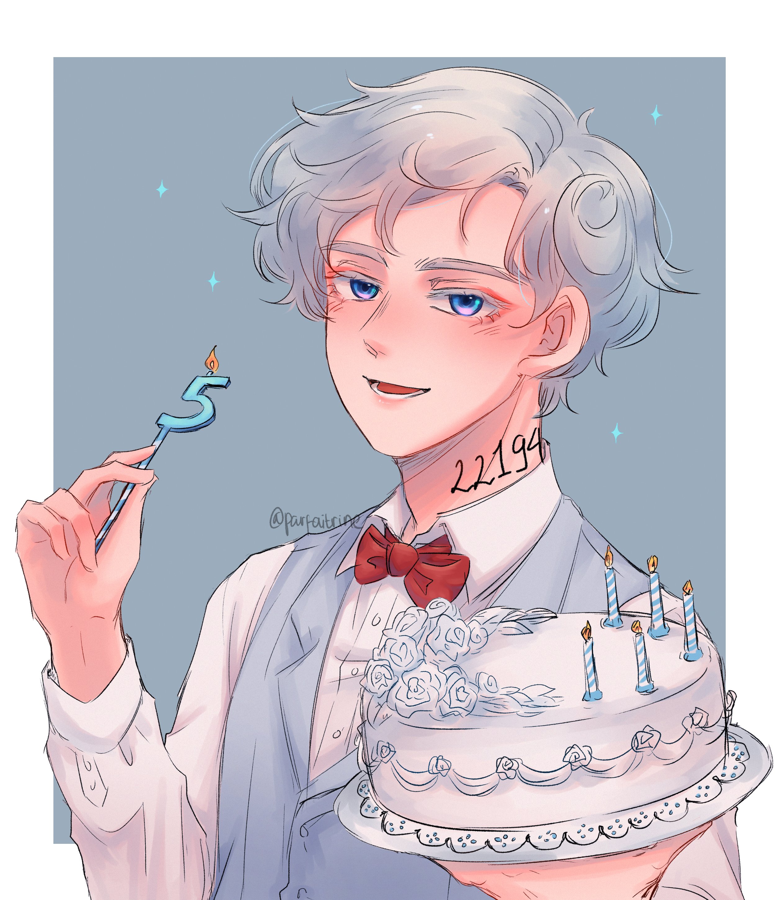 1boy absurdres blue_eyes blue_vest bow bowtie cake candle food grey_hair highres holding holding_candle male_focus neck_tattoo norman_(yakusoku_no_neverland) number_candle number_tattoo open_mouth parfaitrine red_bow red_bowtie shirt short_hair solo tattoo vest white_shirt yakusoku_no_neverland