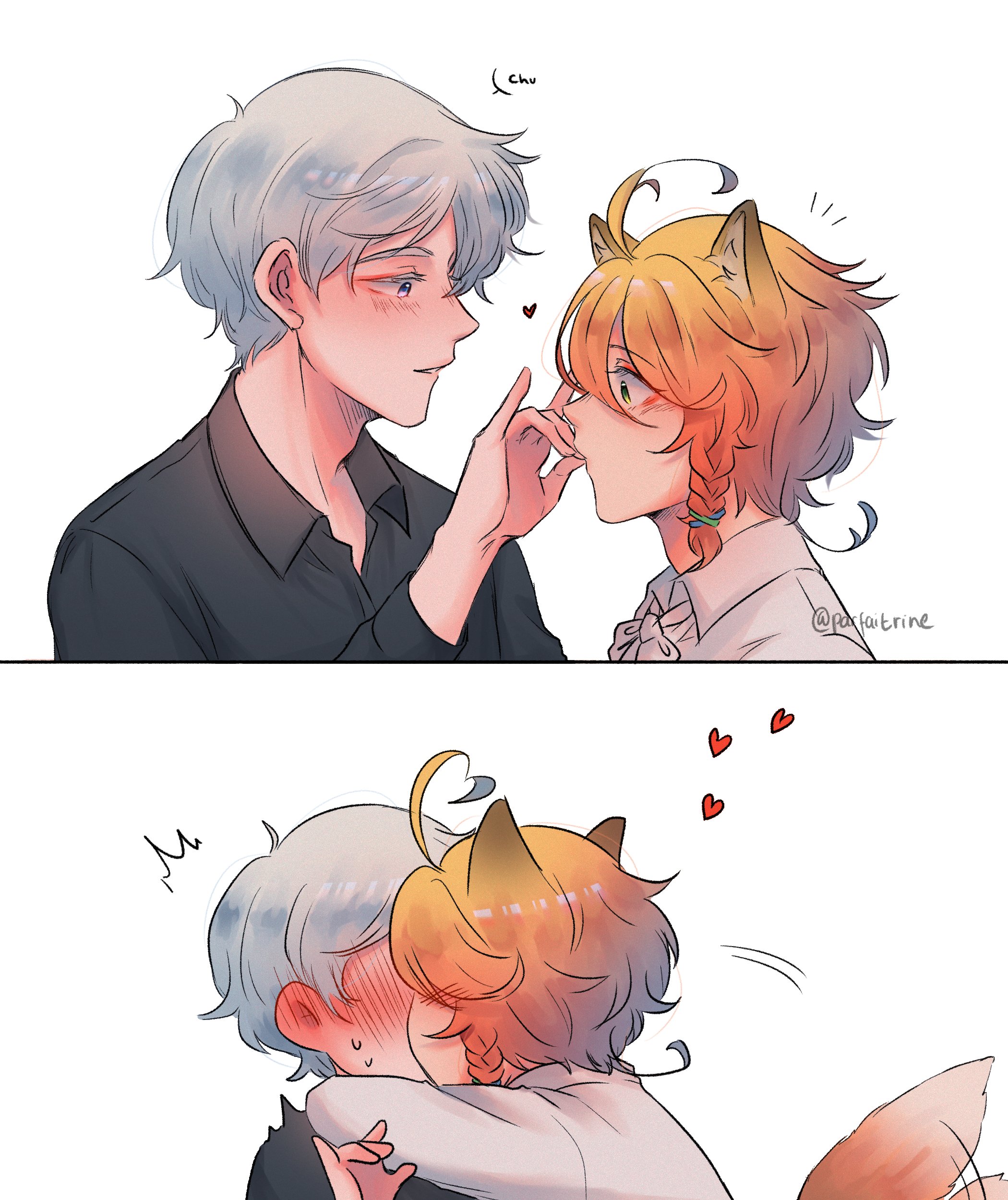 1boy 1girl absurdres animal_ears black_shirt blue_eyes blush braid cat_ears cat_tail emma_(yakusoku_no_neverland) fox_shadow_puppet green_eyes grey_hair hair_ornament heart hetero highres hug kiss long_sleeves medium_hair norman_(yakusoku_no_neverland) parfaitrine shirt tail white_background white_shirt yakusoku_no_neverland