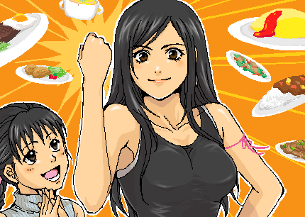 2girls age_difference arm_ribbon black_hair black_shirt braid brown_eyes clenched_hand curry determined egg final_fantasy final_fantasy_vii final_fantasy_vii:_advent_children food hand_on_own_hip hand_up happy height_difference long_hair looking_at_another looking_at_viewer looking_up lowres marlene_wallace multiple_girls omelet omurice open_mouth orange_background outline own_hands_together pink_ribbon plate popochan-f ribbon shirt sleeveless sleeveless_sweater sleeveless_turtleneck smile steak sweater tank_top tifa_lockhart turtleneck turtleneck_sweater upper_body white_outline white_sweater