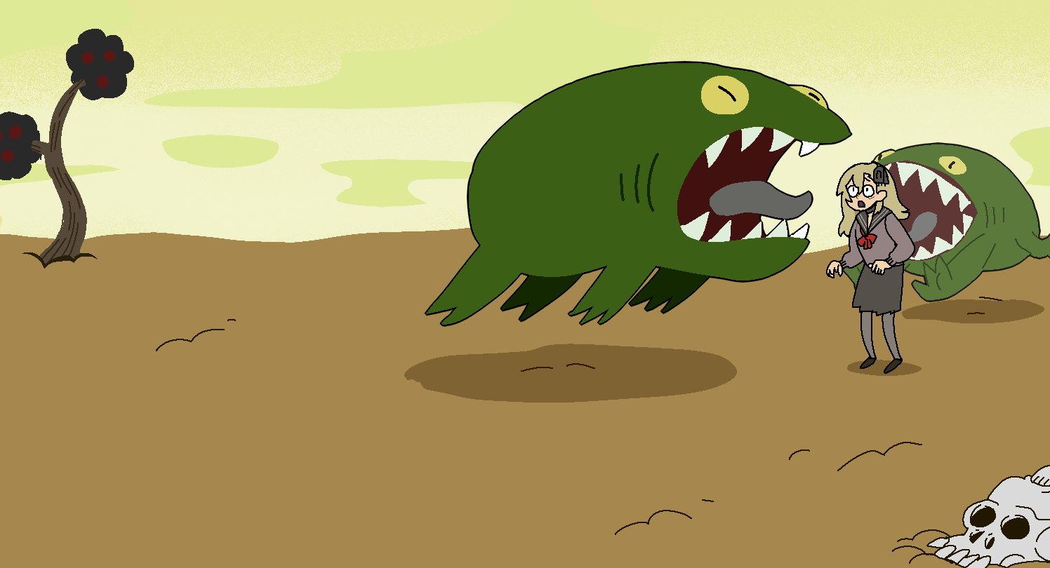 1girl blonde_hair borrowed_character frog hair_between_eyes insect_hair_ornament justin_roiland_(style) matangomu-chan monster original parody pleated_skirt rick_and_morty school_uniform serafuku sharp_teeth shioinu_kemushi skirt skull style_parody teeth