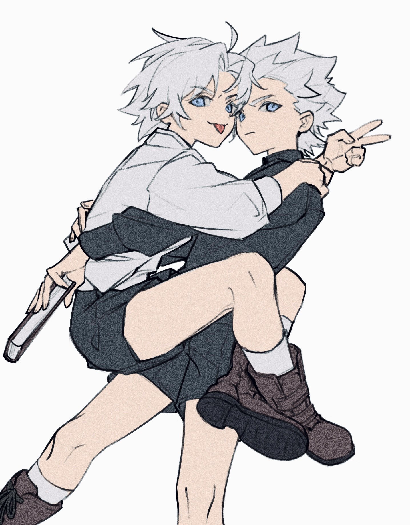 2boys aged_down blue_eyes book boots brothers carrying carrying_person dante_(devil_may_cry) devil_may_cry_(series) devil_may_cry_5 hair_slicked_back highres holding holding_book hug male_focus multiple_boys short_shorts shorts siblings simple_background smile tongue tongue_out twins v vergil_(devil_may_cry) white_background white_hair www_(1184187582)