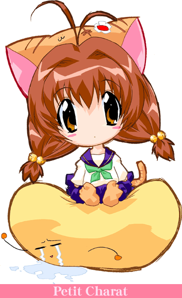1girl animal_ears animal_hat antenna_hair bad_id blue_sailor_collar blue_skirt blush_stickers border brown_eyes brown_hair cat_ears cat_hat cat_tail chibi chibi_only closed_eyes closed_mouth collared_shirt commentary copyright_name crying di_gi_charat dot_mouth dress_shirt expressionless fake_animal_ears full_body gema green_neckerchief hair_between_eyes hair_bobbles hair_ornament hat head_tilt long_hair long_sleeves looking_at_viewer low_twintails neckerchief orange_socks pink_border pleated_skirt puchiko puddle sailor_collar school_uniform serafuku shirt simple_background sitting sitting_on_person skirt socks solo streaming_tears tail tears twintails white_background white_border white_shirt yamamura_hiroki