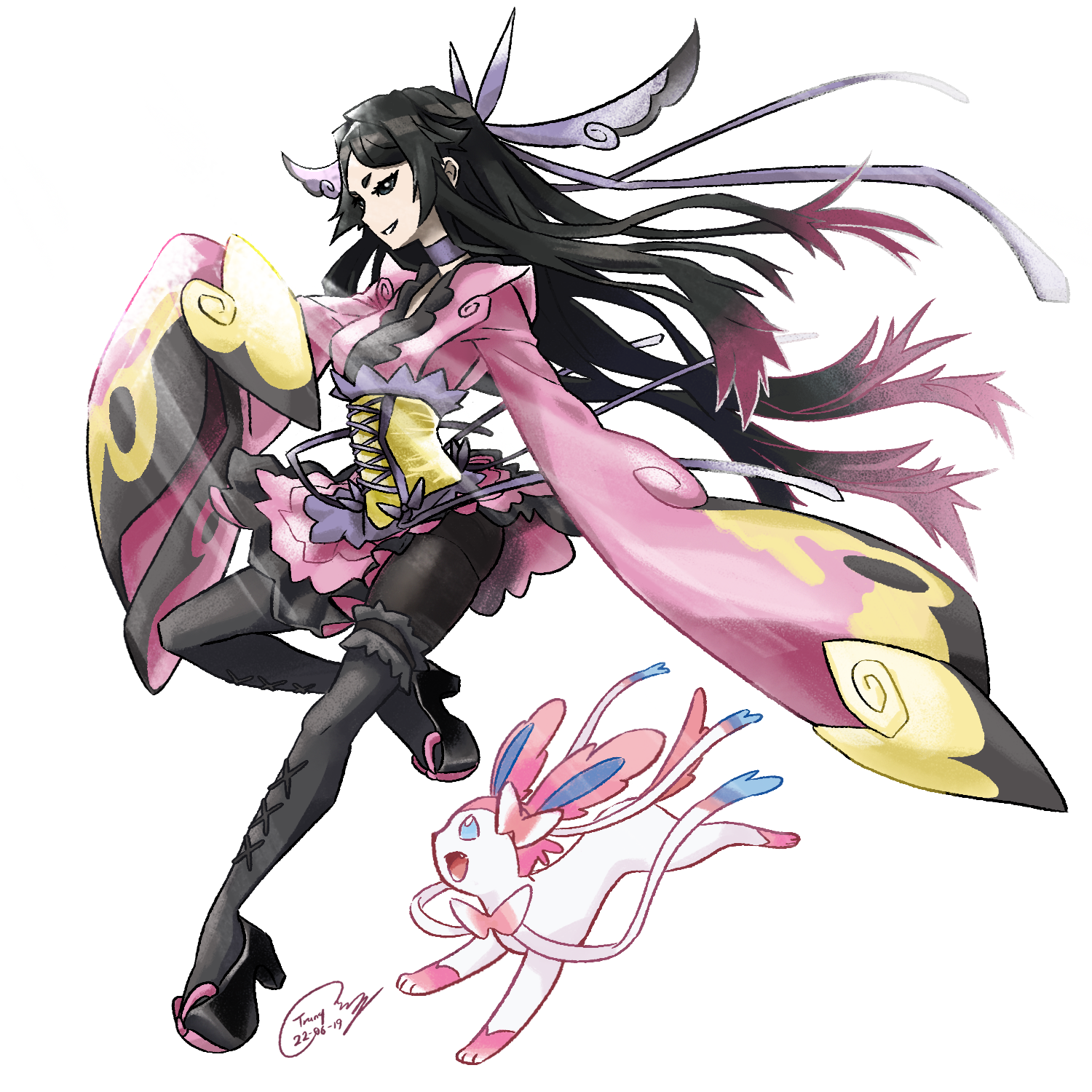 1girl black_footwear black_hair cabonara_artblock full_body gen_6_pokemon grey_eyes high_heels highres japanese_clothes kimono long_sleeves nintendo pink_kimono pokemon pokemon_(creature) pokemon_x_and_y signature simple_background sleeves_past_fingers sleeves_past_wrists sylveon valerie_(pokemon) white_background wide_sleeves