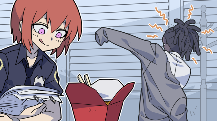 2girls annoyed black_hair blue_eyes brown_hair chopsticks commentary cornrows dark-skinned_female dark_skin earrings food formal_clothes helltaker holding holding_paper indoors jewelry kyo-hei_(kyouhei) licking_lips multiple_girls necktie noodles oyster_pail paper police police_(helltaker) police_swat_(helltaker) police_uniform policewoman putting_on_jacket shirt short_hair suit untranslatable_commentary takeout_container tongue tongue_out very_dark_skin white_shirt window_blinds