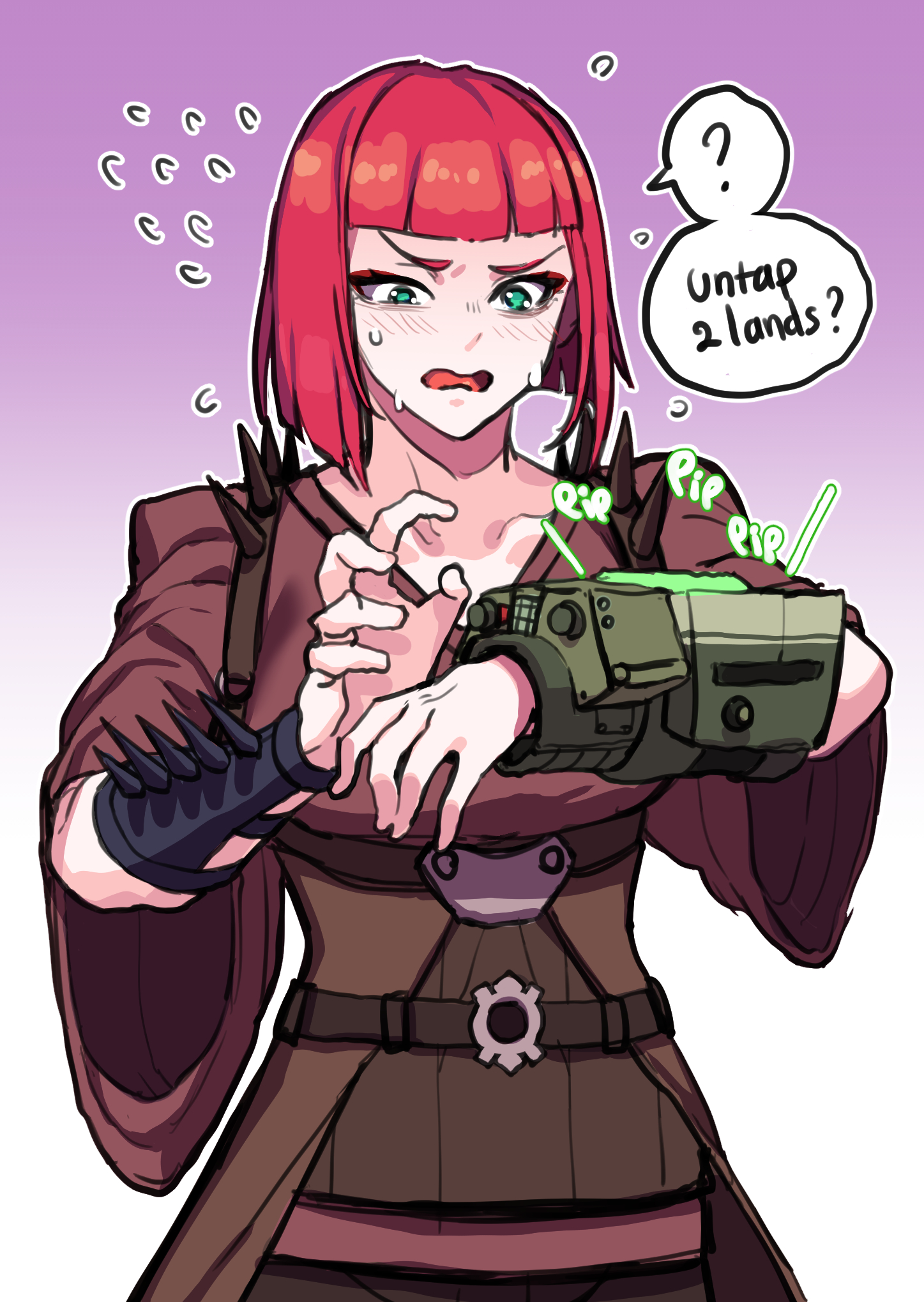 1girl ? ashnod belt blunt_bangs blush bodice breasts brown_shirt ceteee21 commentary crossover english_commentary english_text fallout flying_sweatdrops glowing gradient_background green_eyes hand_up highres looking_down magic:_the_gathering medium_breasts medium_hair monitor o-ring_strap open_mouth outline pale_skin panicking pip_boy purple_background red_hair shirt shoulder_spikes simple_background solo speech_bubble spiked_gauntlets spikes sweat two-tone_background white_background white_outline