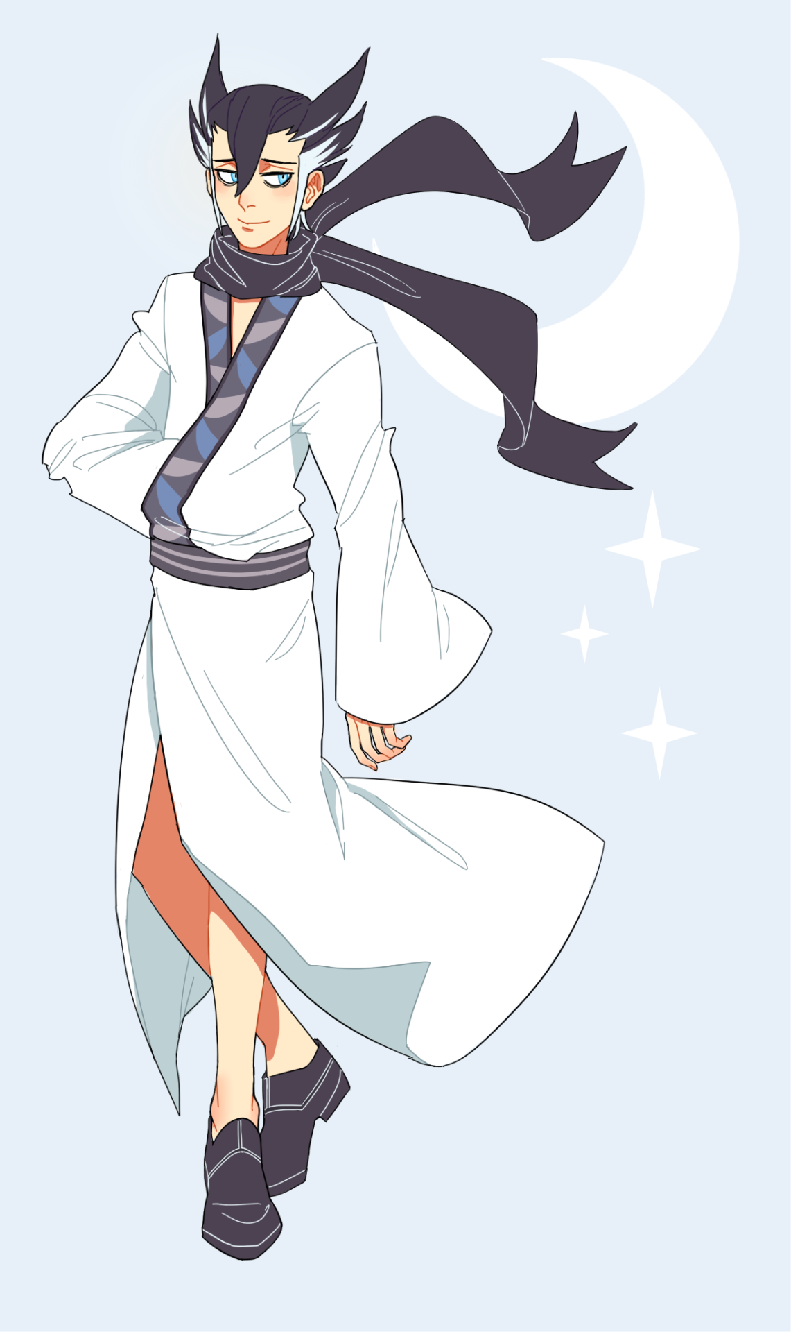 1boy black_footwear black_hair black_scarf blue_eyes grey_background grimsley_(pokemon) highres japanese_clothes kimono long_sleeves male_focus multicolored_hair natalia_baldina nintendo pokemon pokemon_sun_and_moon scarf sleeves_past_wrists solo sparkle two-tone_hair white_hair white_kimono