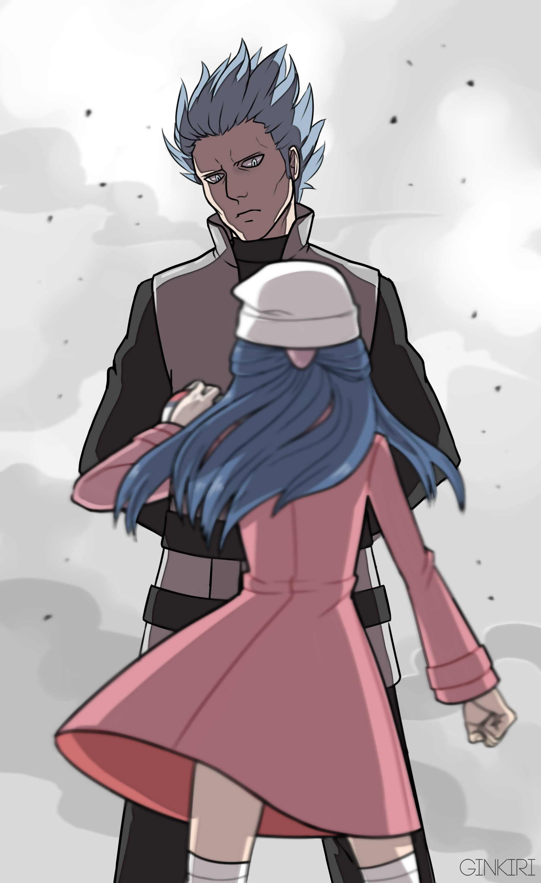 1boy 1girl absurdres artist_name beanie blue_eyes clenched_hand cyrus_(pokemon) dawn_(pokemon) face-to-face from_behind hat highres holding holding_poke_ball looking_at_another natalia_baldina nintendo poke_ball poke_ball_(basic) pokemon pokemon_diamond/pearl/platinum pokemon_platinum team_galactic white_hat